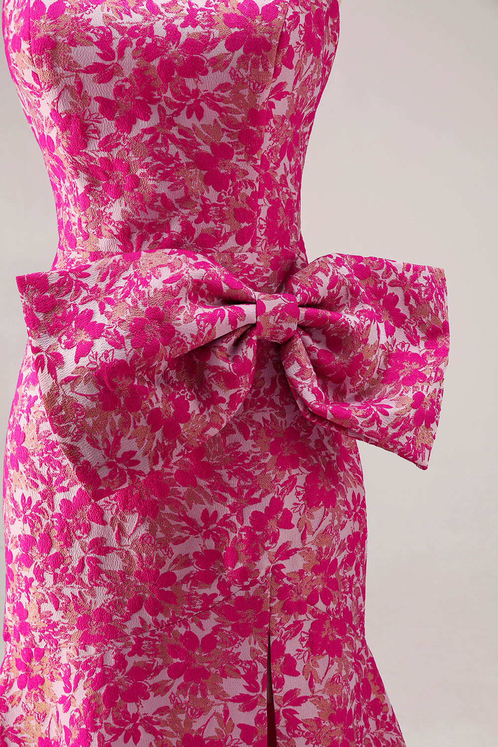 Strapless Fuchsia Flower Mermaid Jacquard Long Prom Dress with Bow