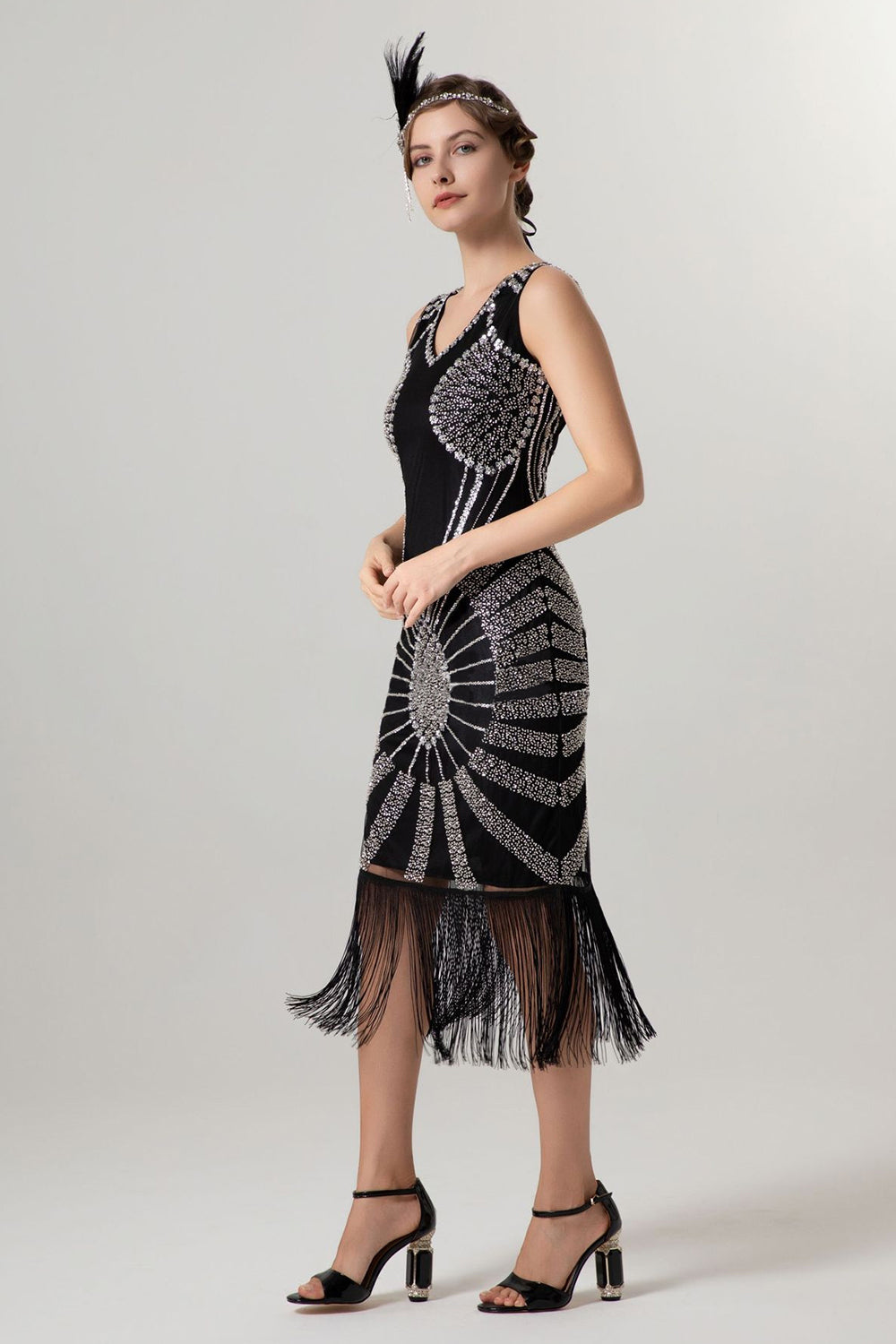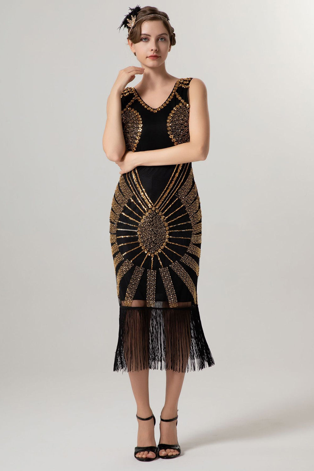 Black Golden Sheath Sequins 1920s Dress With Tassles
