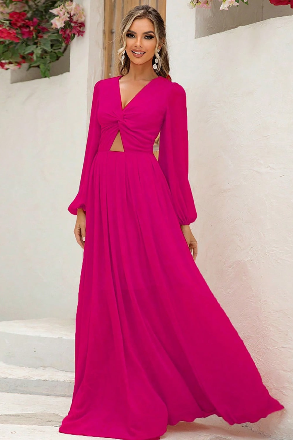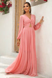Blush A-Line Long Sleeves V Neck Long Wedding Guest Dress