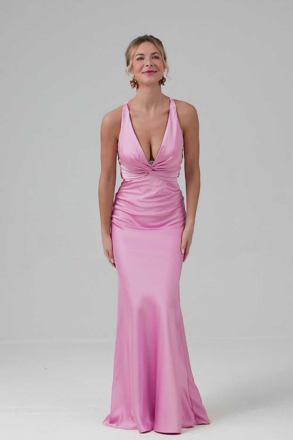 Elegant Pink Mermaid Deep V Neck Long Bridesmaid Dress with Lace Up Back