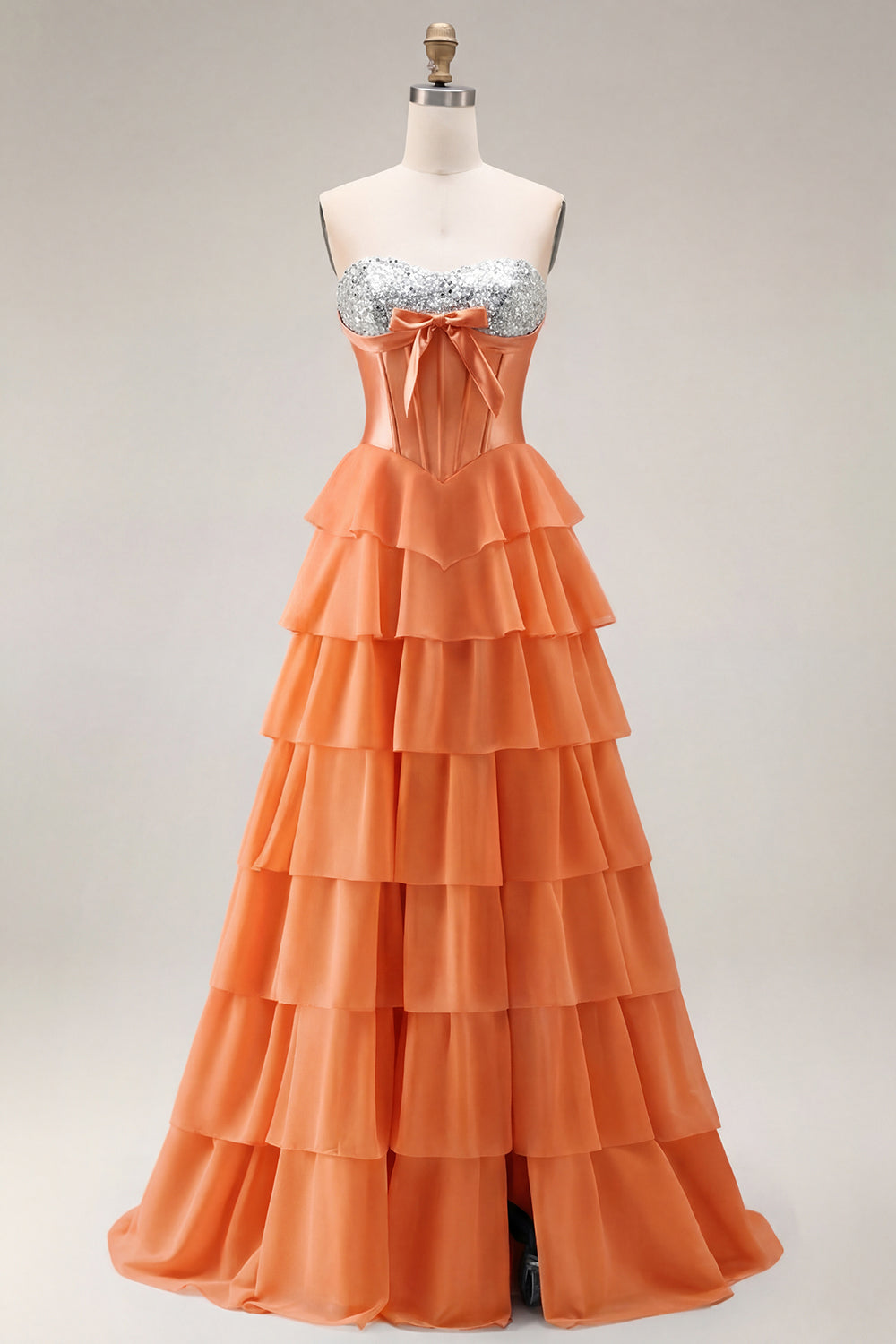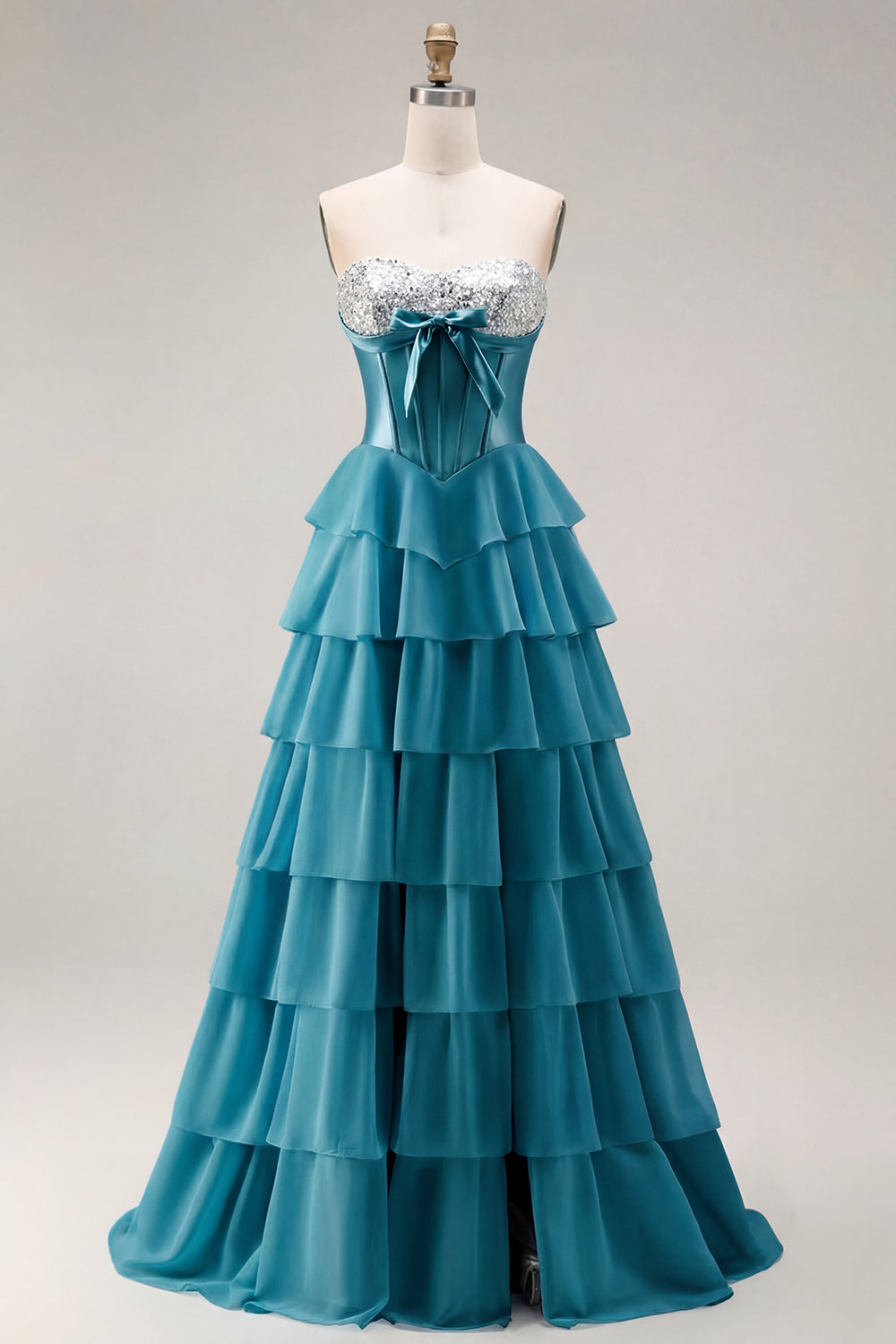 Strapless Pink A Line Tiered Ruffle Sequin Corset Long Prom Dress with Slit