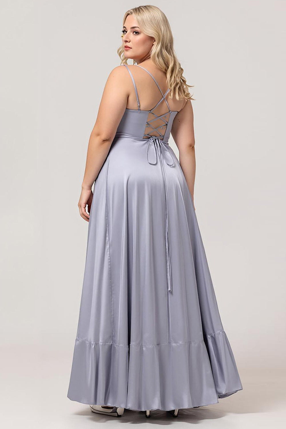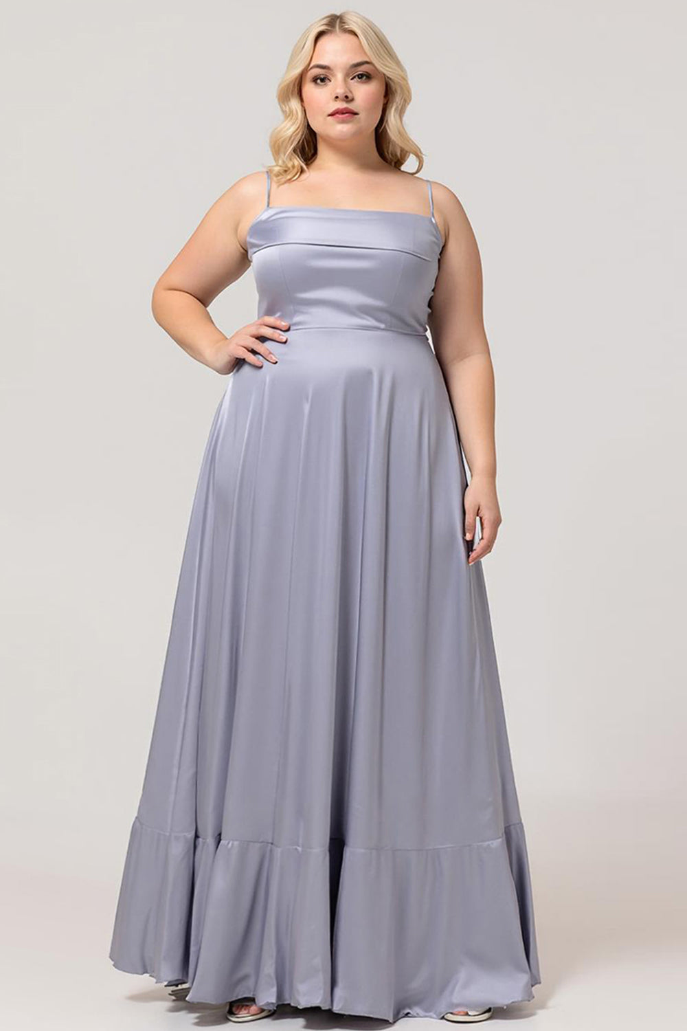 Dusty Blue A-Line Satin Long Plus Size Bridesmaid Dress with Lace Up Back