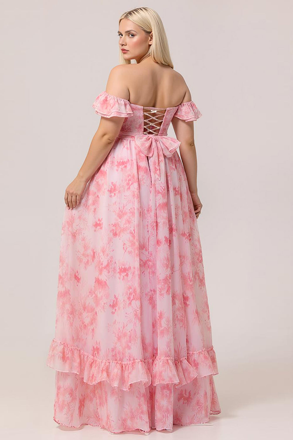 Pink Floral A-Line Off The Shoulder Plus Size Bridesmaid Dress with Ruffles