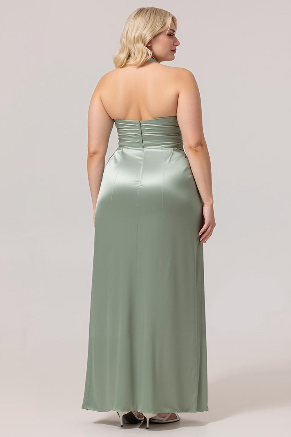Sage Green Sheath Satin High Neck Backless Long Plus Size Bridesmaid Dress with Side Slit