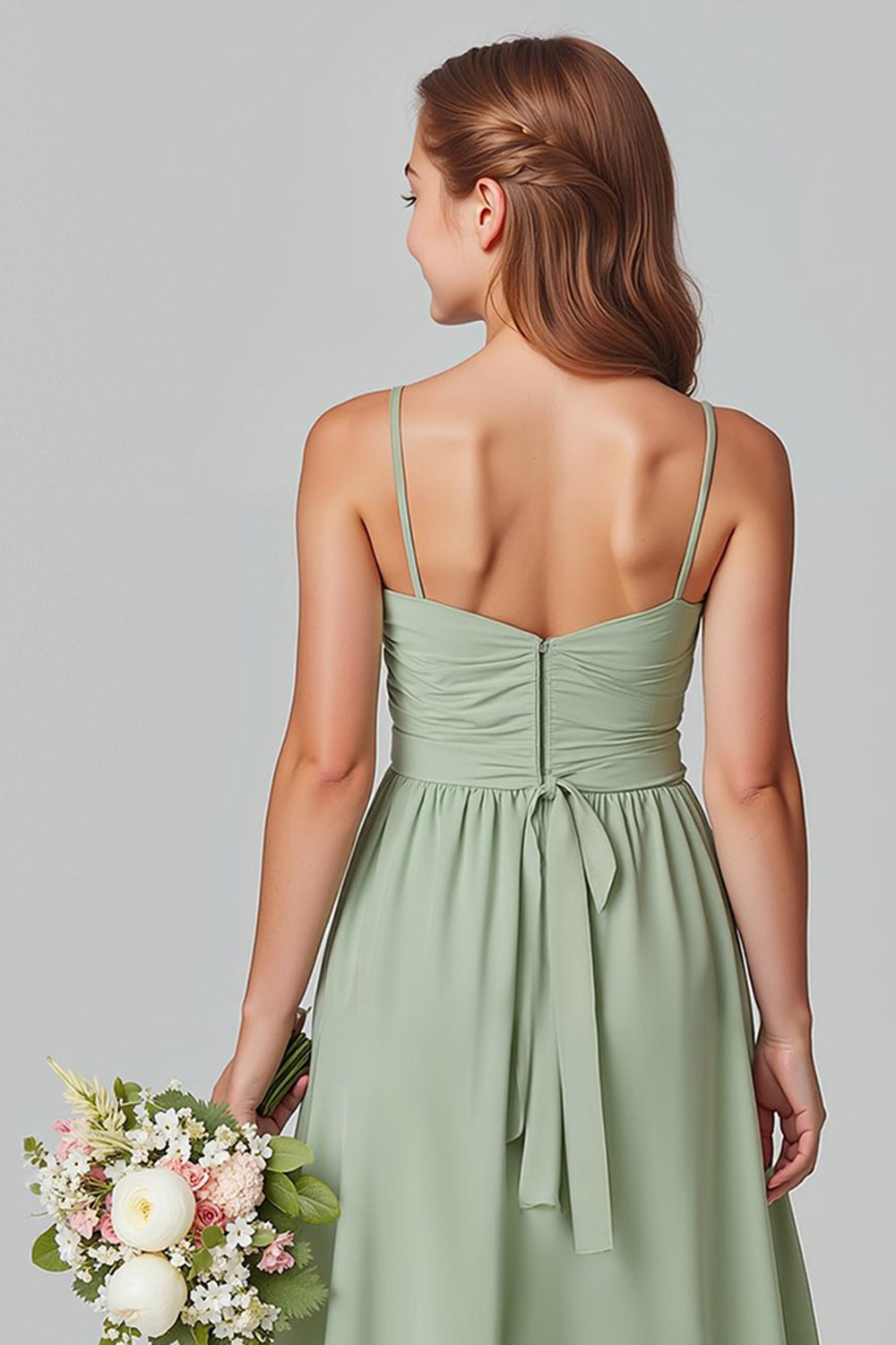Ruffled Chiffon Sage Green A-Line Spaghetti Straps Long Junior Bridesmaid Dress