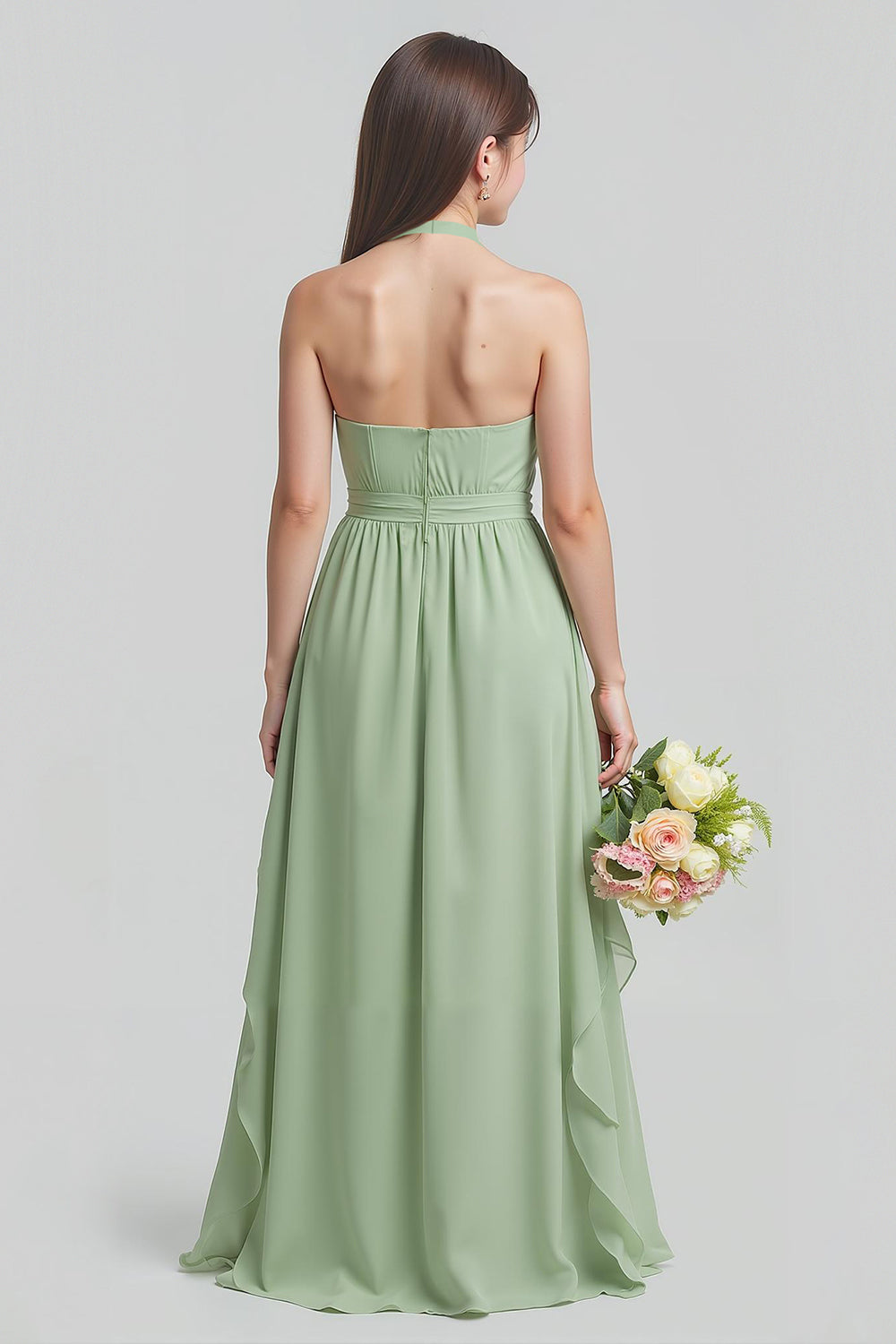 Sage Green Halter A-Line Chiffon Long Junior Bridesmaid Dress with Ruffles