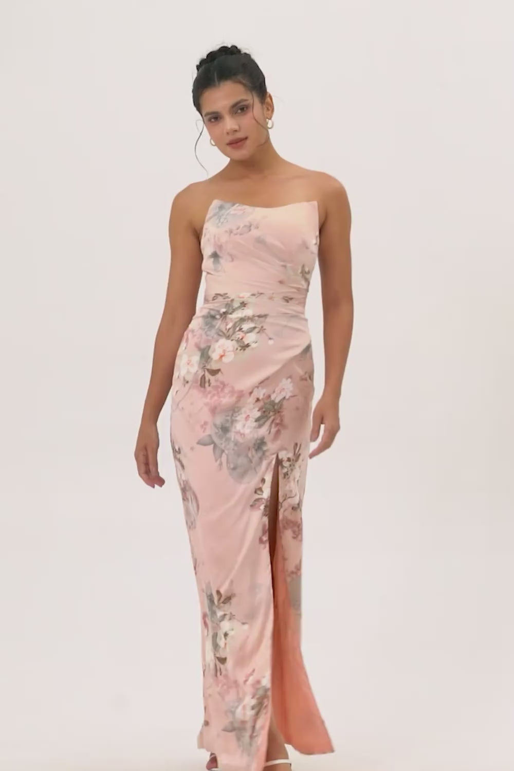 Blush Sheath Strapless Print Satin Long Floral Bridesmaid Dress with Slit