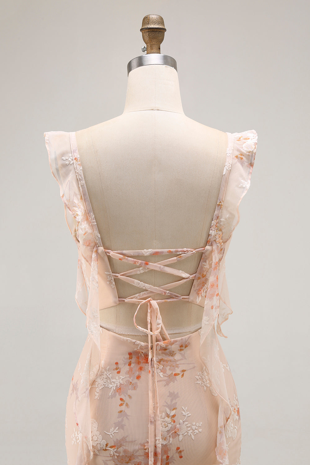 Champagne Sheath Lace Up Back Long Floral Burnout Dress with Slit