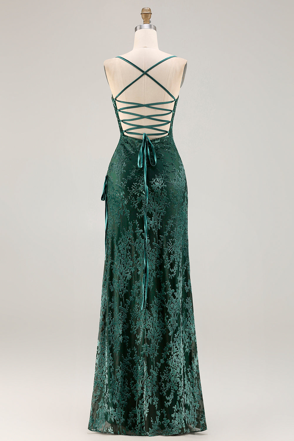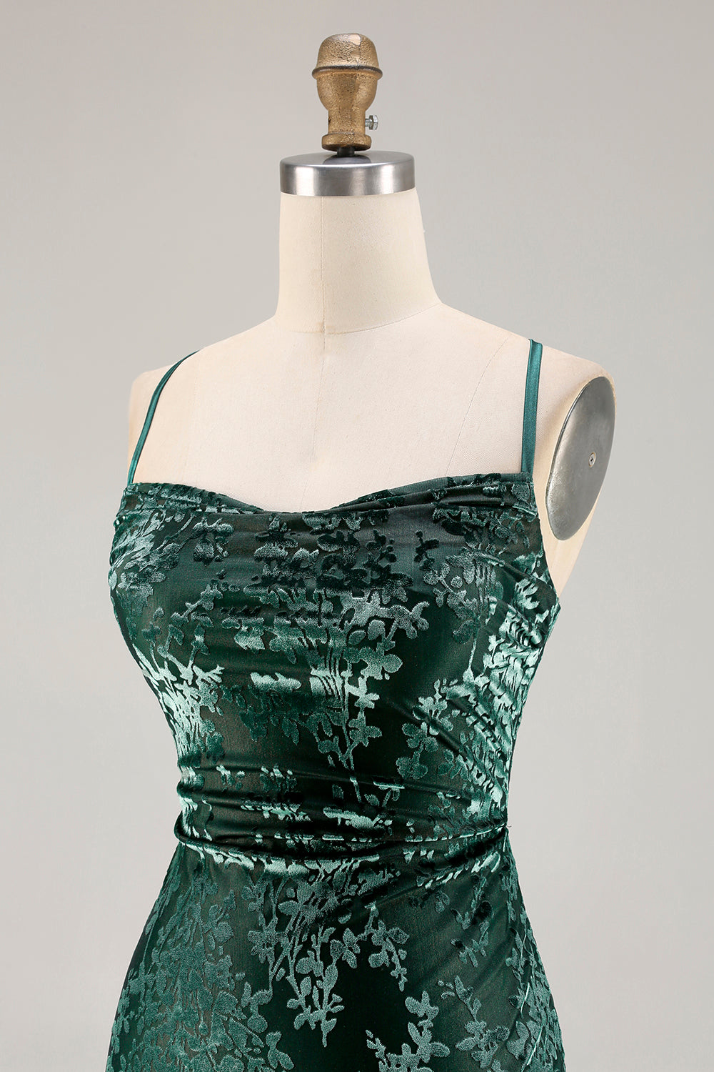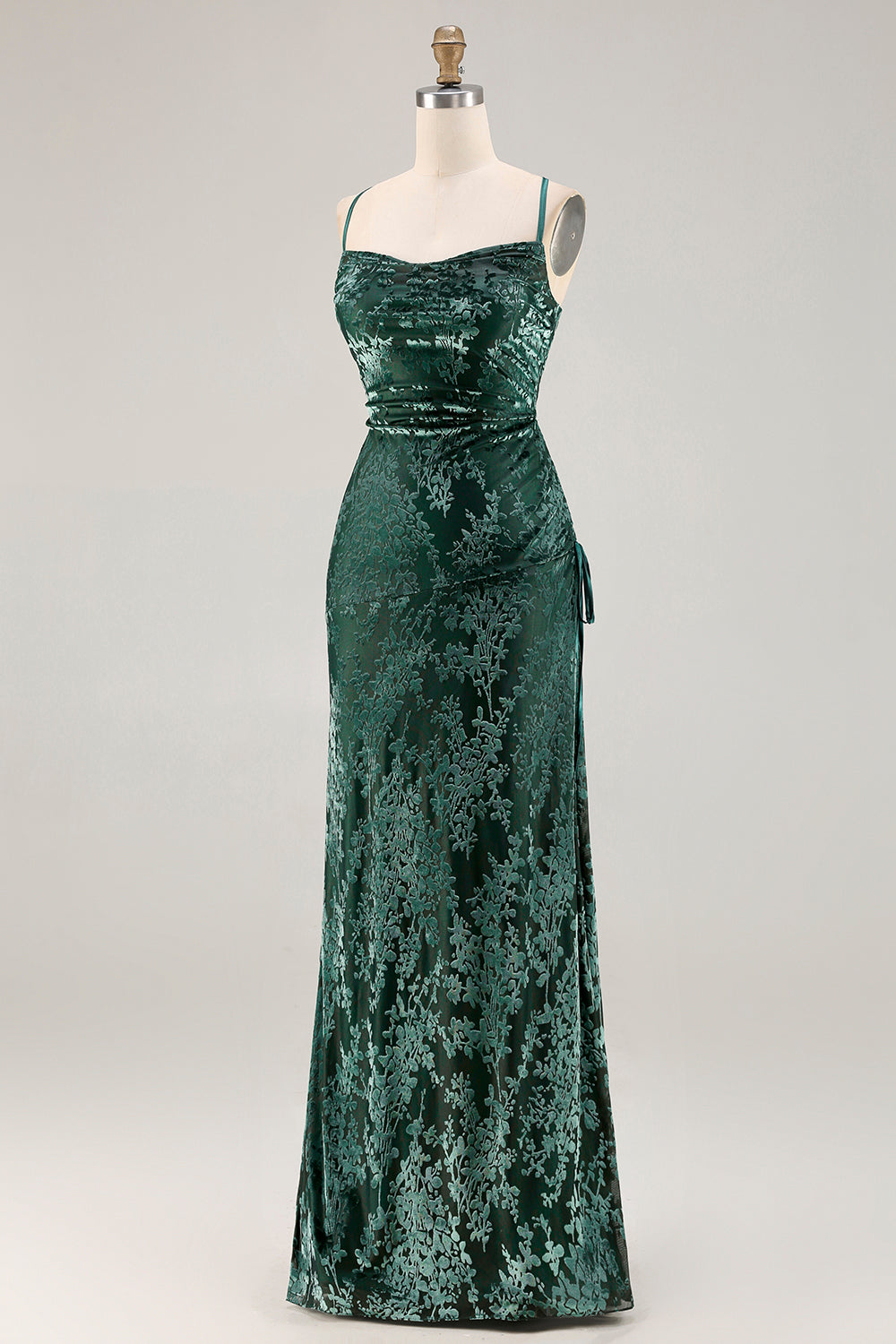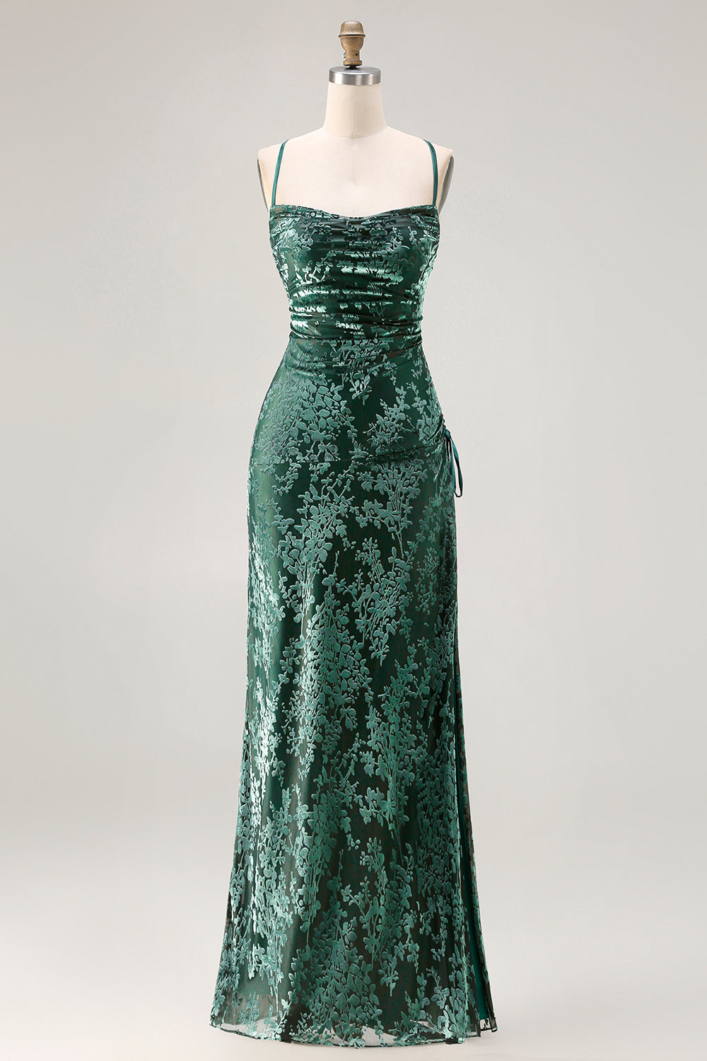 Dark Green Sheath Burnout Velvet Spaghetti Straps Maxi Dress with Lace Up Back