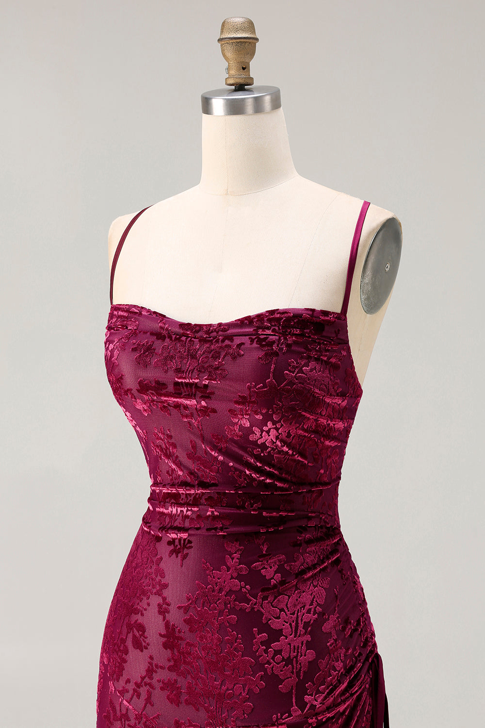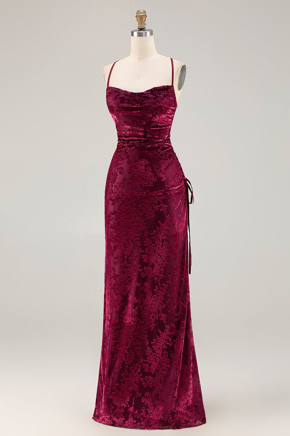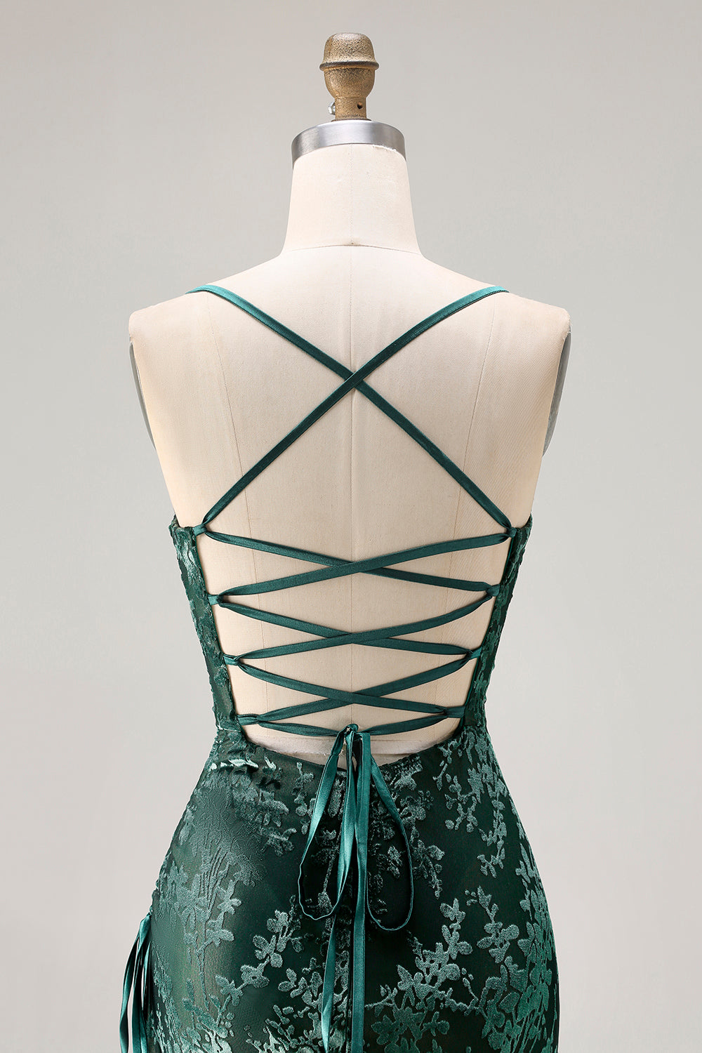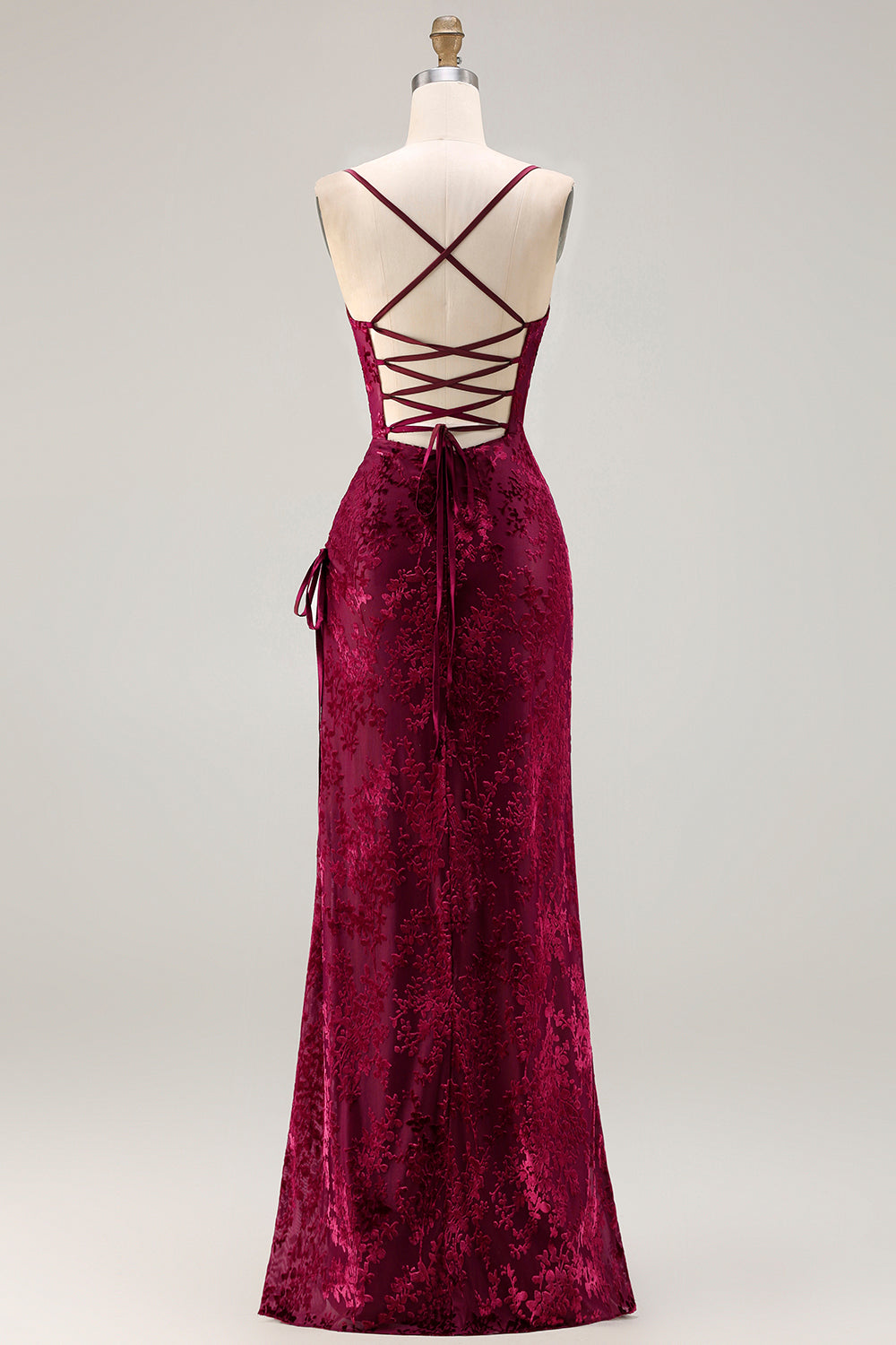 Dark Green Sheath Burnout Velvet Spaghetti Straps Maxi Dress with Lace Up Back