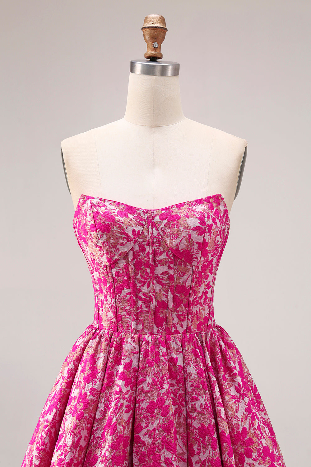 Fuchsia Flower Strapless A Line Jacquard Long Prom Dress