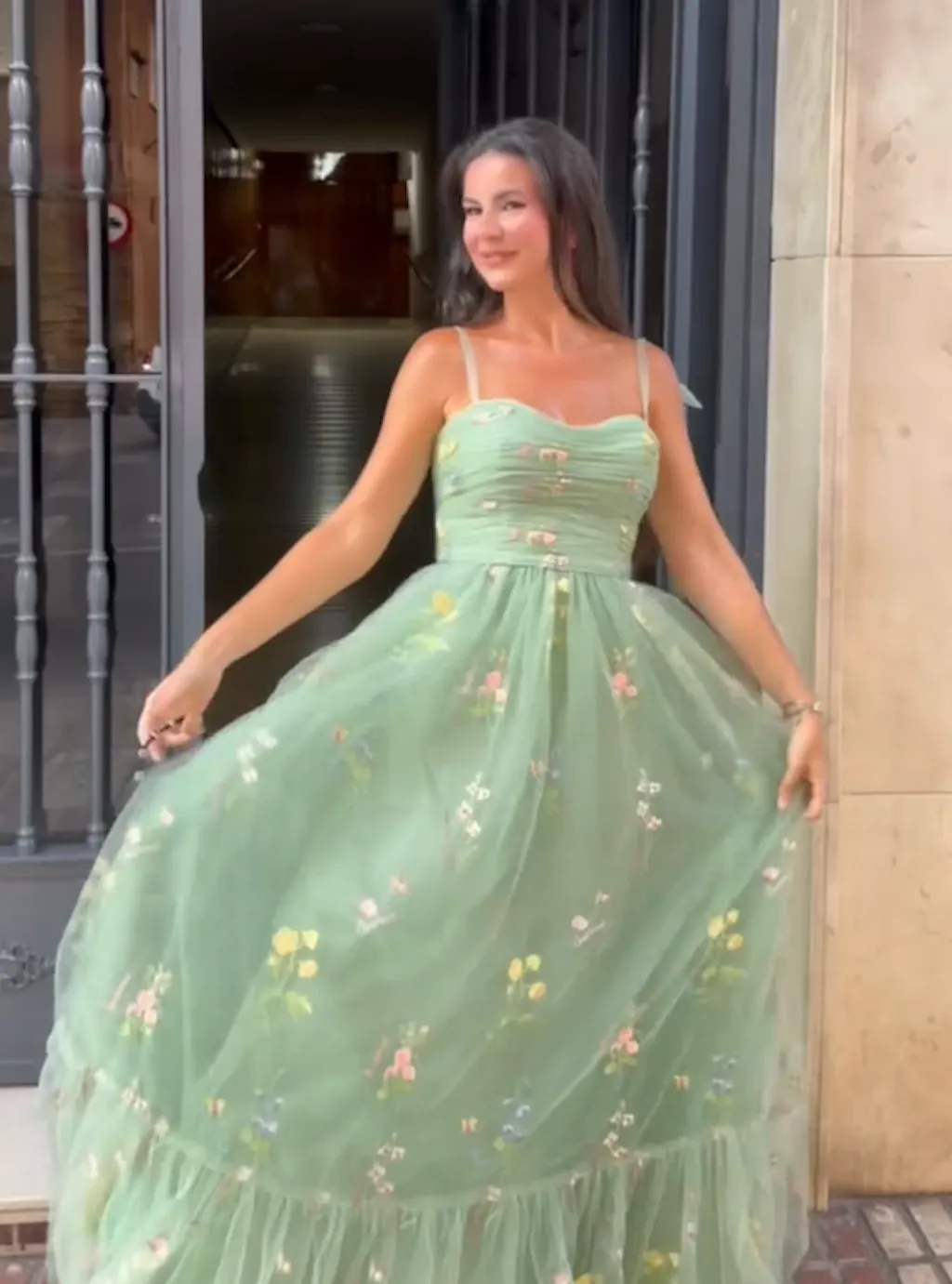 Green Tulle A Line Spaghetti Straps Floral Long Prom Dress With Embroidery