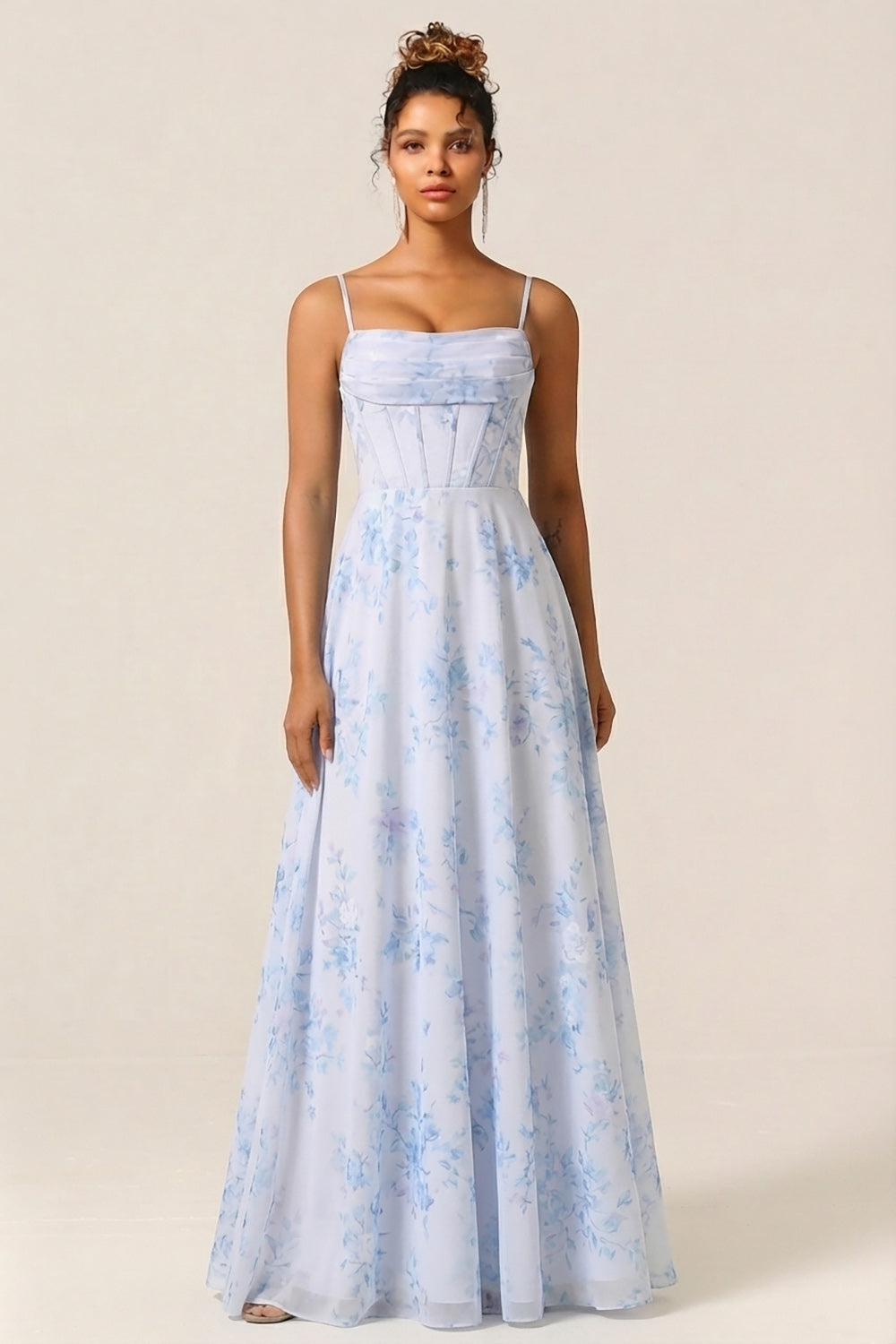 Blue Floral Corset A Line Printed Chiffon Long Bridesmaid Dress