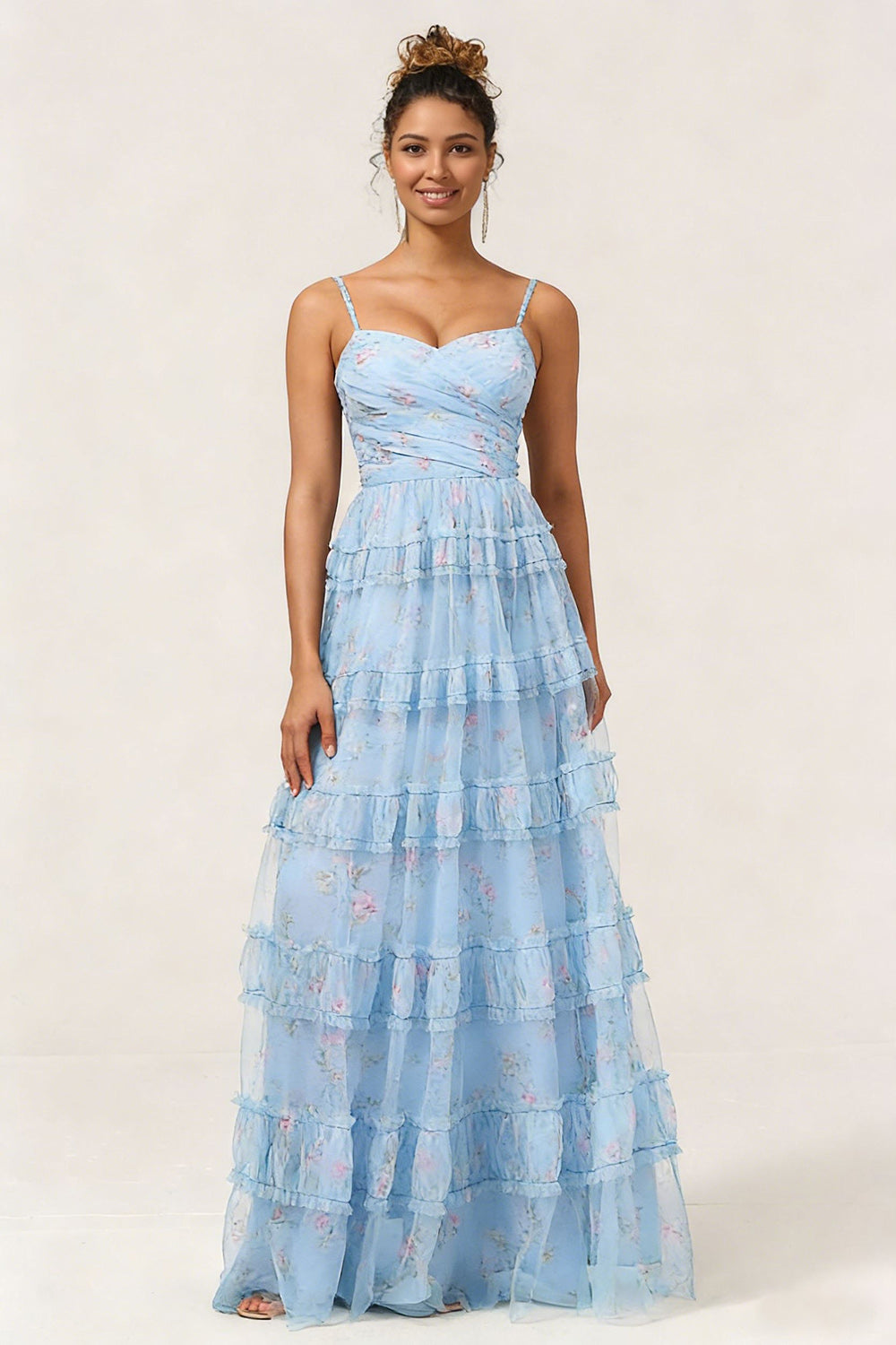 Blue Floral Printed A Line Tiered Ruffle Long Bridesmaid Dress
