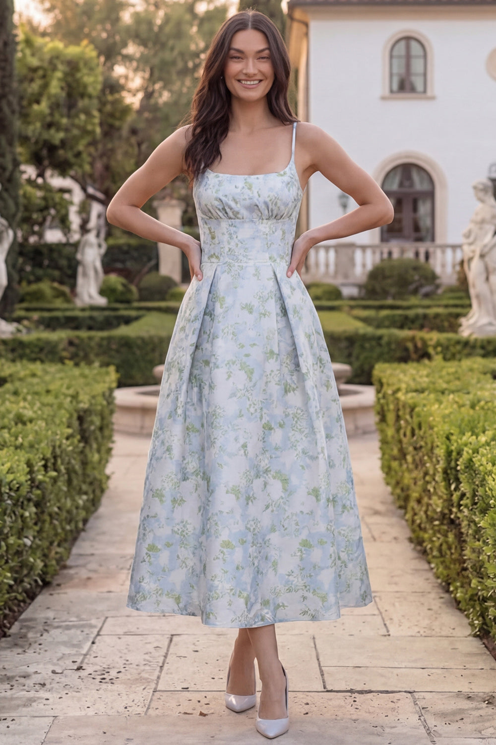 Blue White Flower A Line Square Neck Midi Wedding Guest Dress