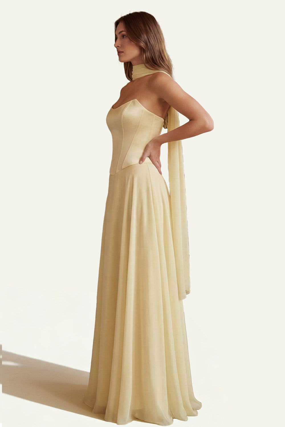 Daffodil Strapless A Line Corset Long Bridesmaid Dress with Streamer