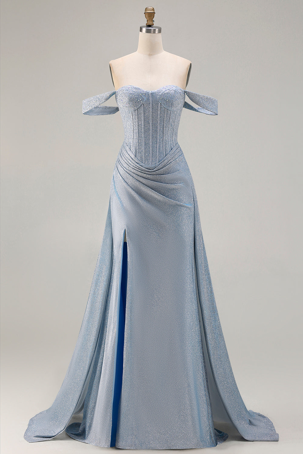 Dusty Blue Off the Shoulder Beaded Mermaid Corset Long Prom Dress with Slit