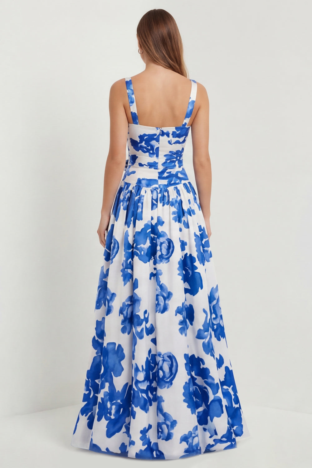 Floral Blue Printed A Line Square Neck Long Bridesmaid Dress with Slit