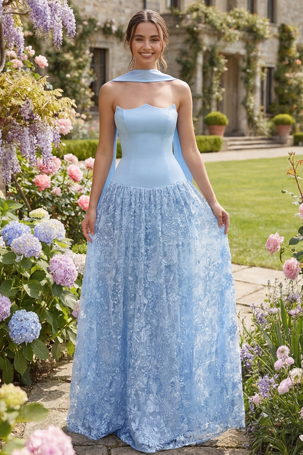 Sky Blue Lace Floral Strapless A Line Long Bridesmaid Dress with Streamer