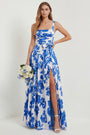 White Blue Floral Strapless A Line Printed Wedding Guest Dress