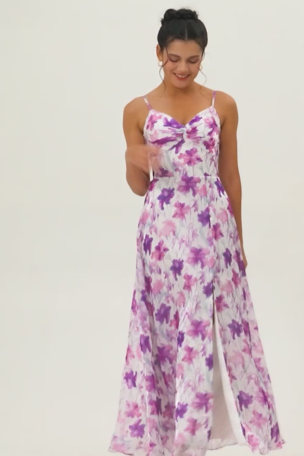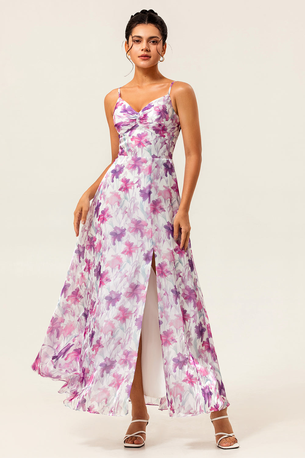 Purple Flower A-Line Spaghetti Straps Front Knot Print Maxi Bridesmaid Dress with Slit