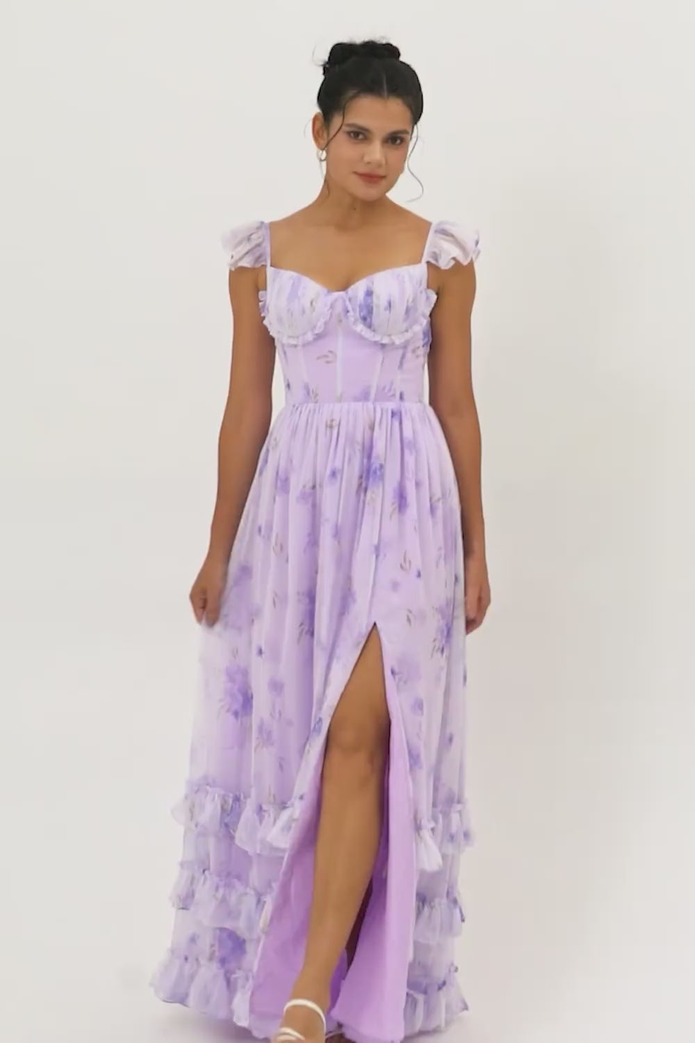 Lavender A-line Corset Lace Up Back Print Long Bridesmaid Dress with Slit