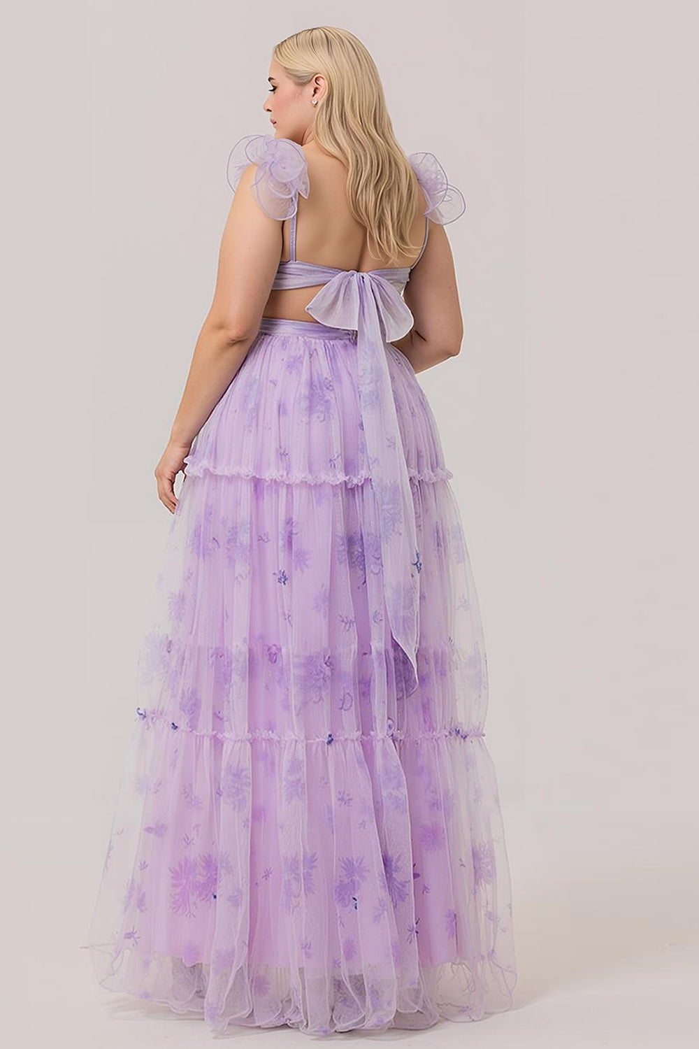 Lavender A-Line Pleated Cut-Out Print Tulle Long Plus Size Bridesmaid Dress
