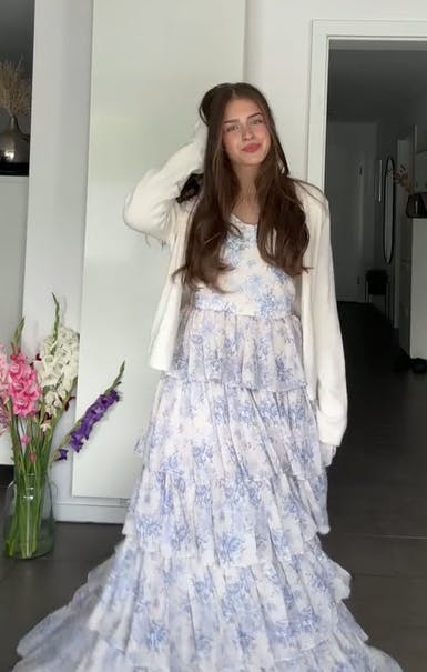 White Blue Flower A Line Spaghetti Straps Tiered Corset Maxi Dress