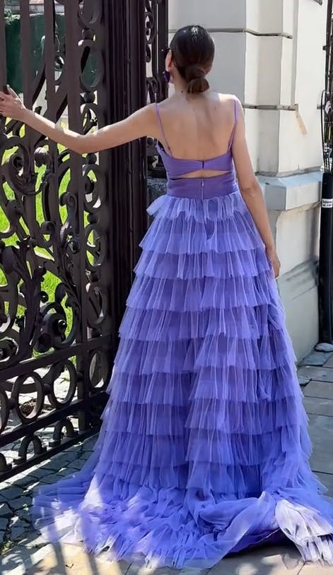 Purple Princess Spaghetti Straps Tiered Long Tulle Prom Dress with Slit