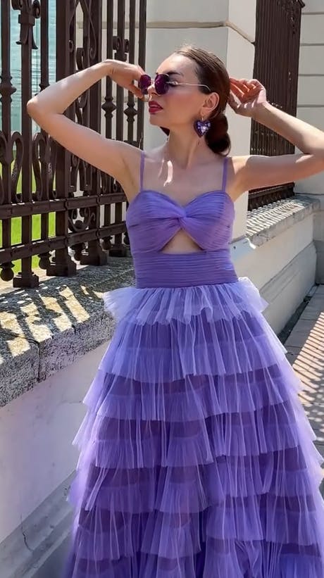 Purple Tulle A-Line Spaghetti Straps Cut Out Tiered Long Prom Dress with Ruffle Slit