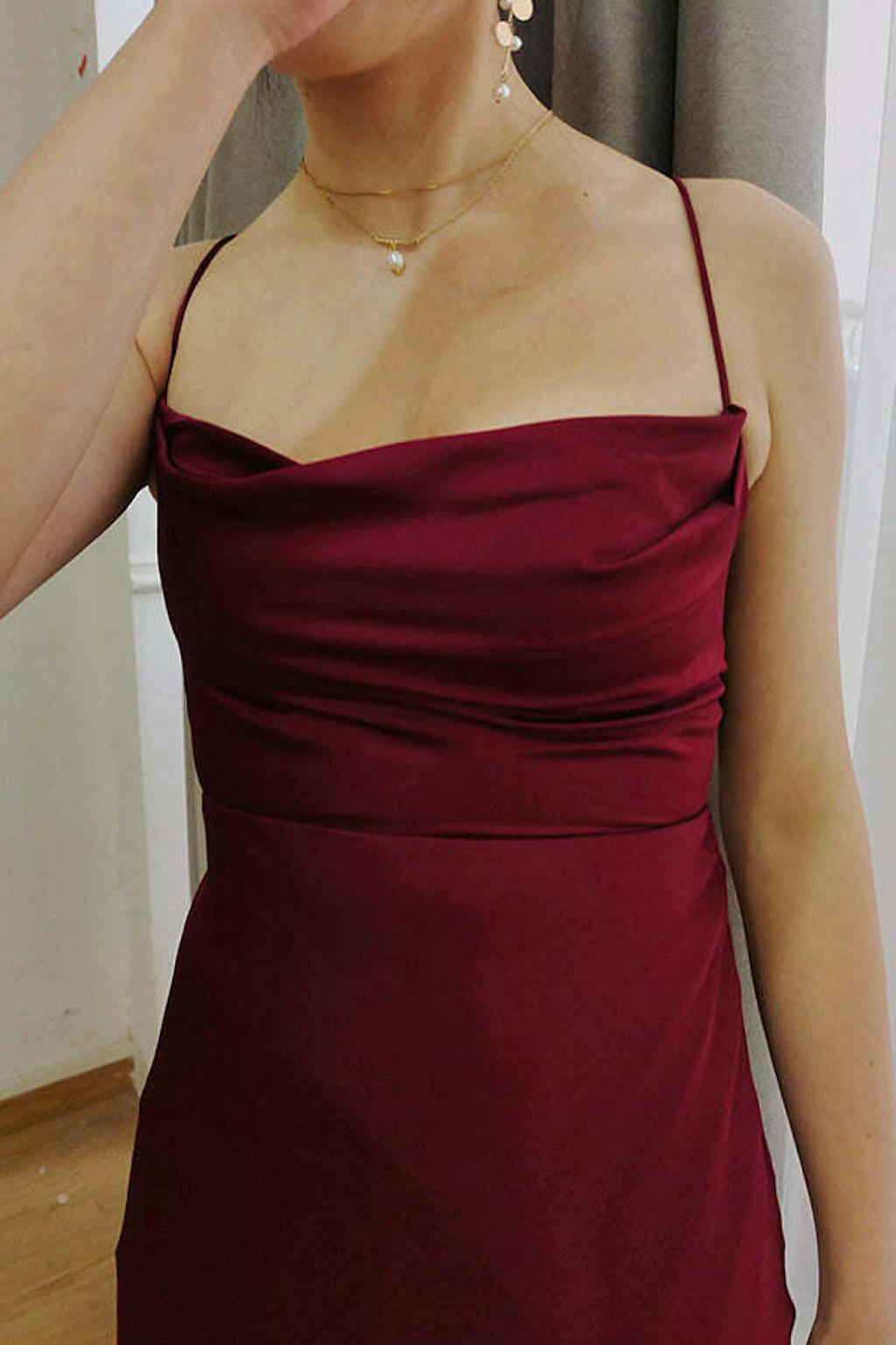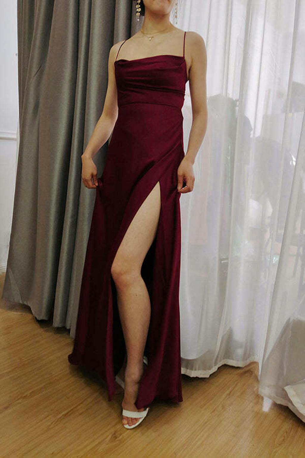 Burgundy A-Line Spaghetti Straps Floor-Length Satin Bridesmaid Dress