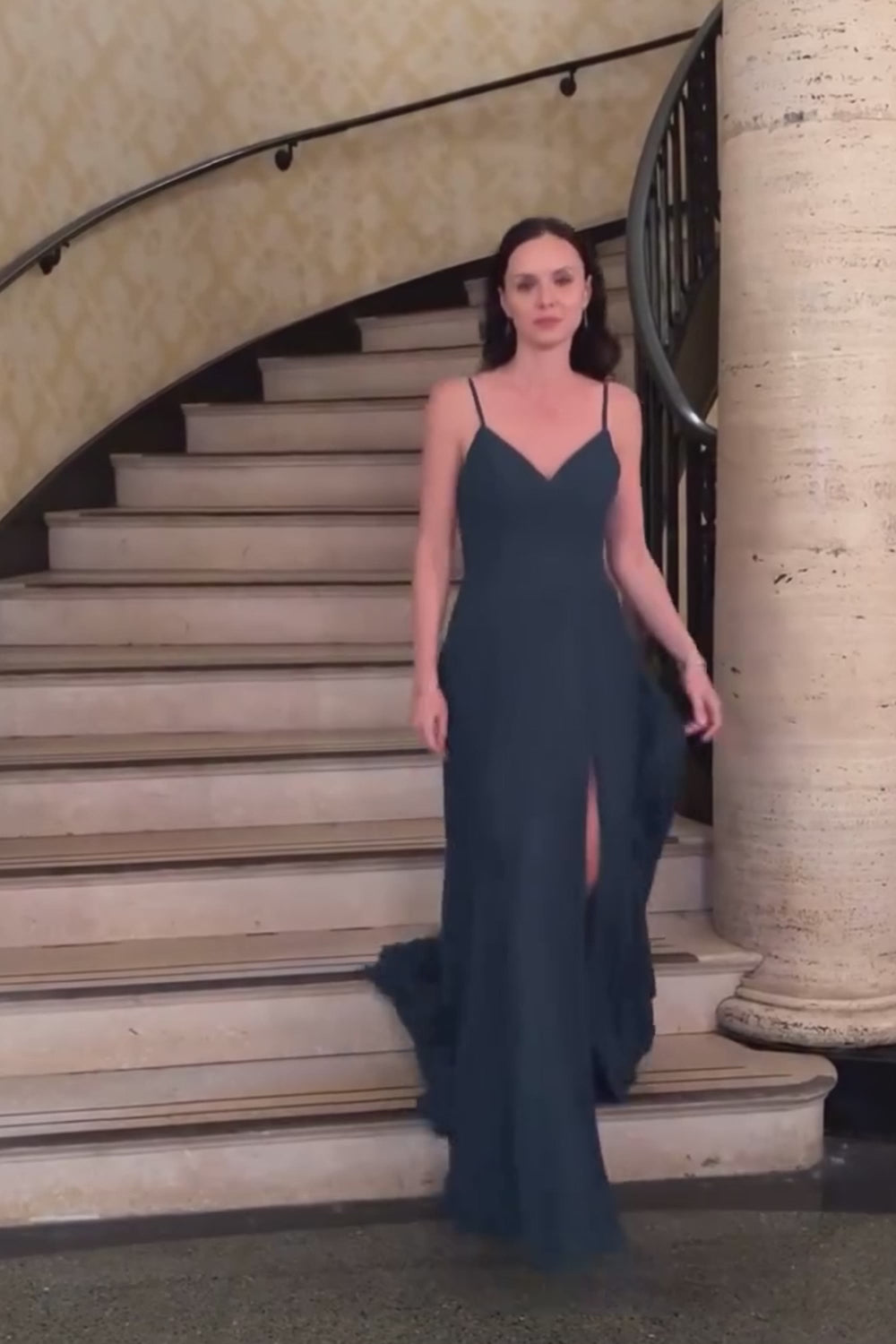 A Line Spaghetti Straps Pleated Chiffon Long Bridesmaid Dress with Slit