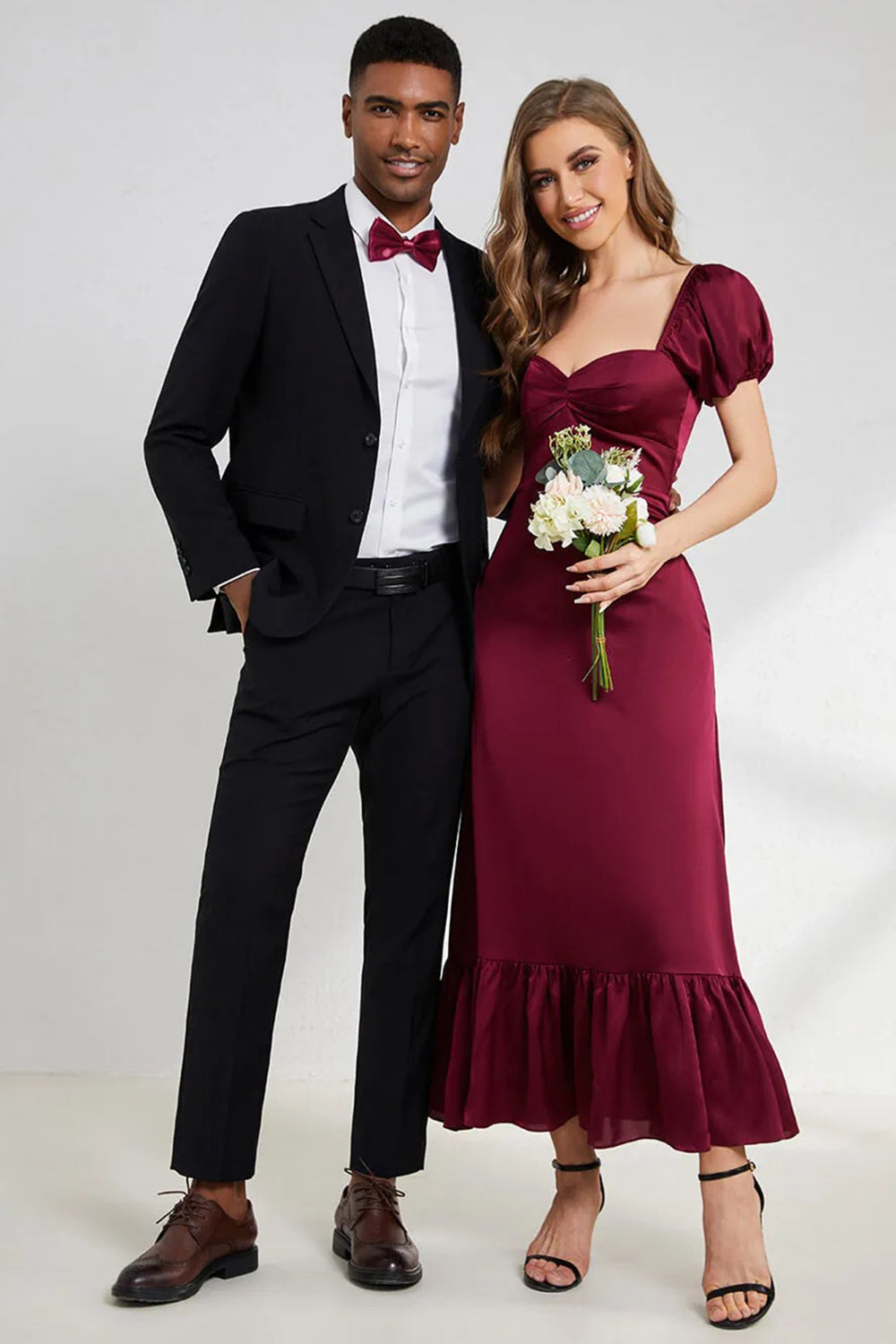 Burgundy Sheath Square Neck Tea-Length Satin Bridesmaid Dress with Ruffles