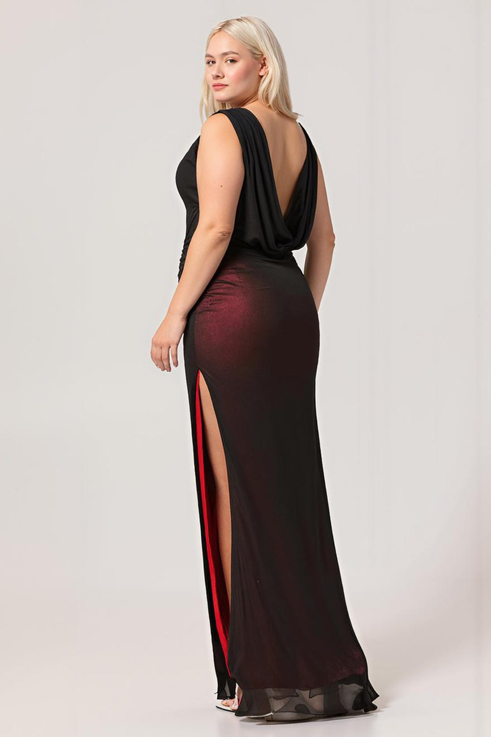 Black Red Sheath Cowl Neck Tulle Open Back Maxi Plus Size Dress with Slit