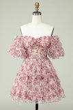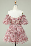 Fuchsia A Line Off the Shoulder Floral Tulle Short Homecoming Dress with Short Sleeves