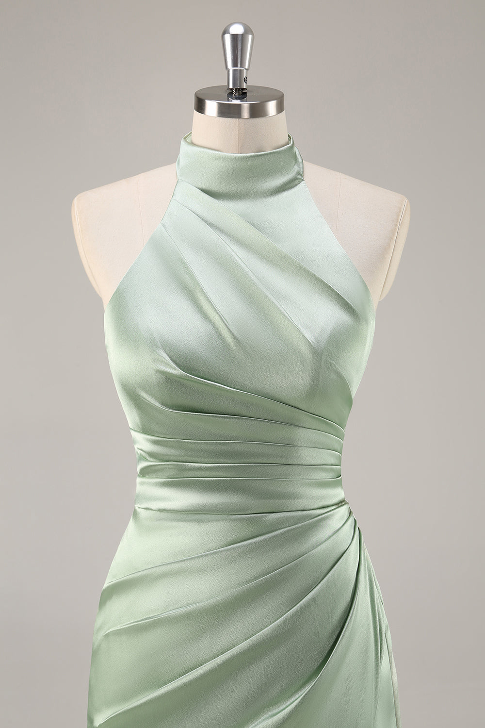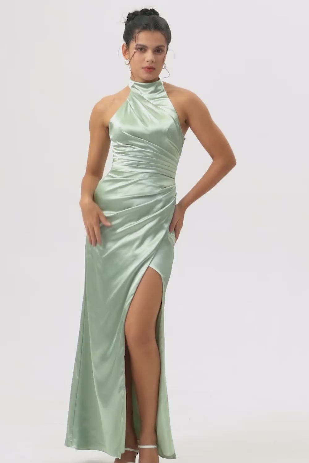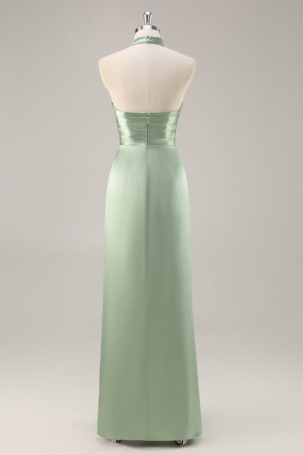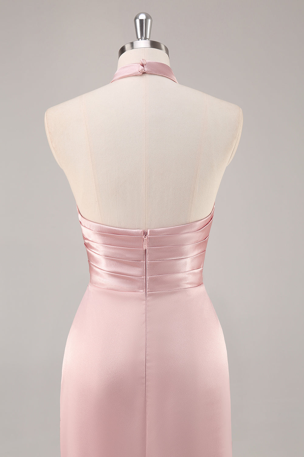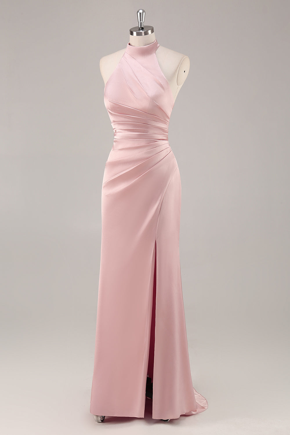 Blush Sheath Halter Satin Pleated Open Back Long Bridesmaid Dress with Slit
