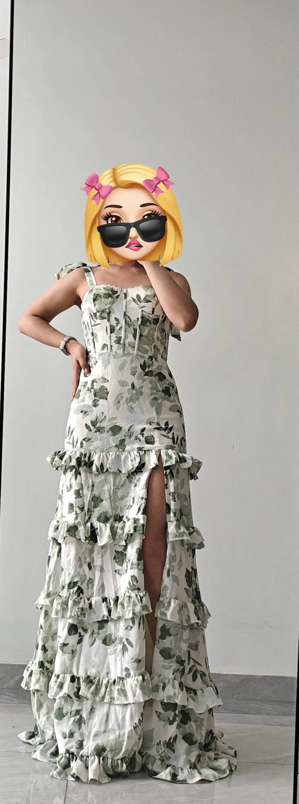 Green A-Line Bow Shoulder Strap Printed Long Floral Dress with Slit