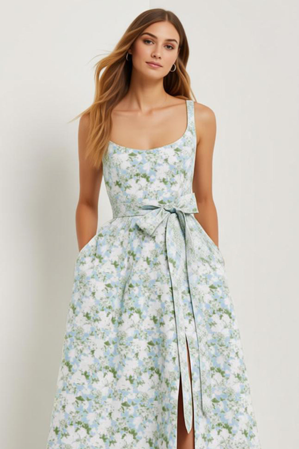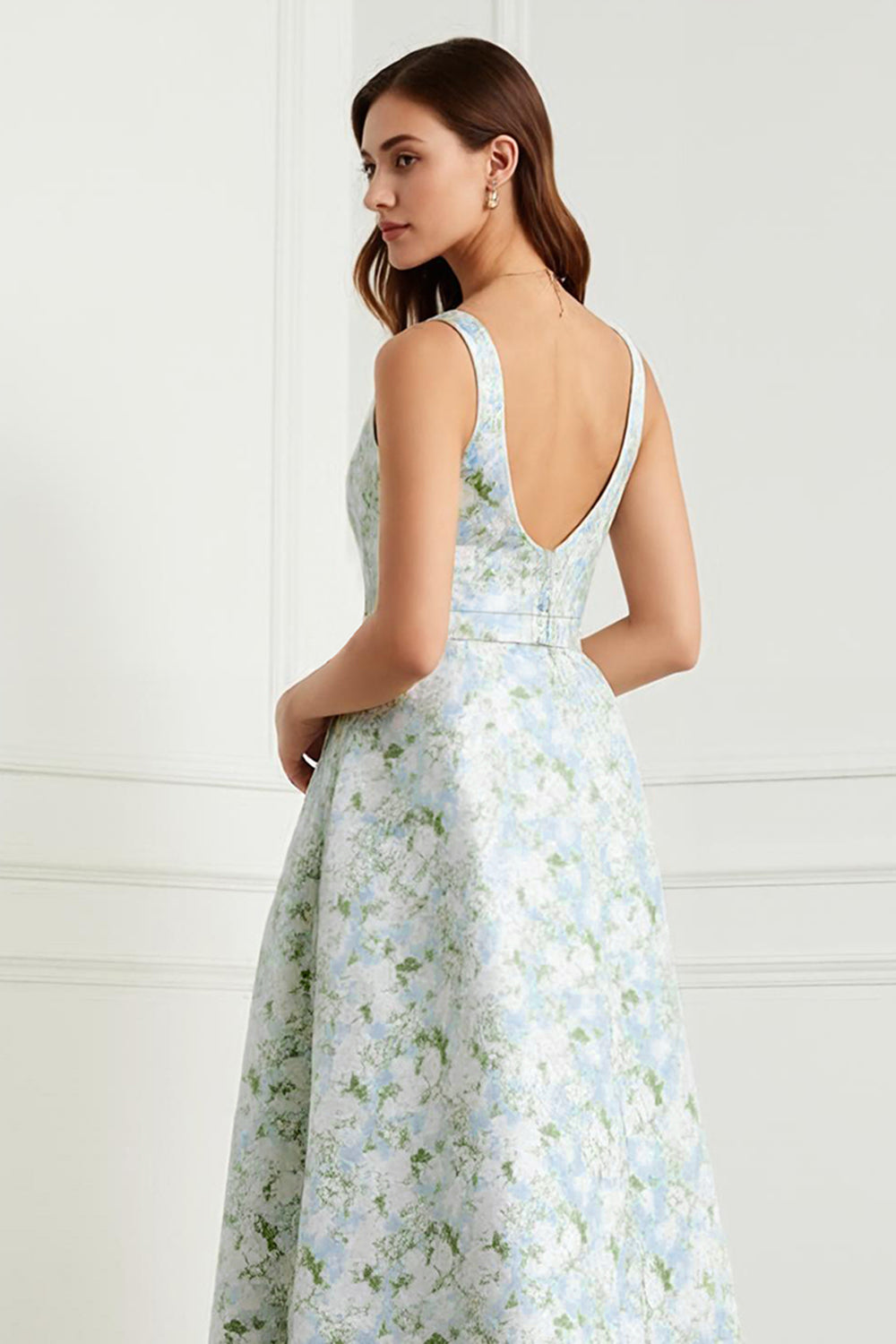 Blue White Flower A-Line Print Bowed Long Satin Wedding Guest Dress with Slit
