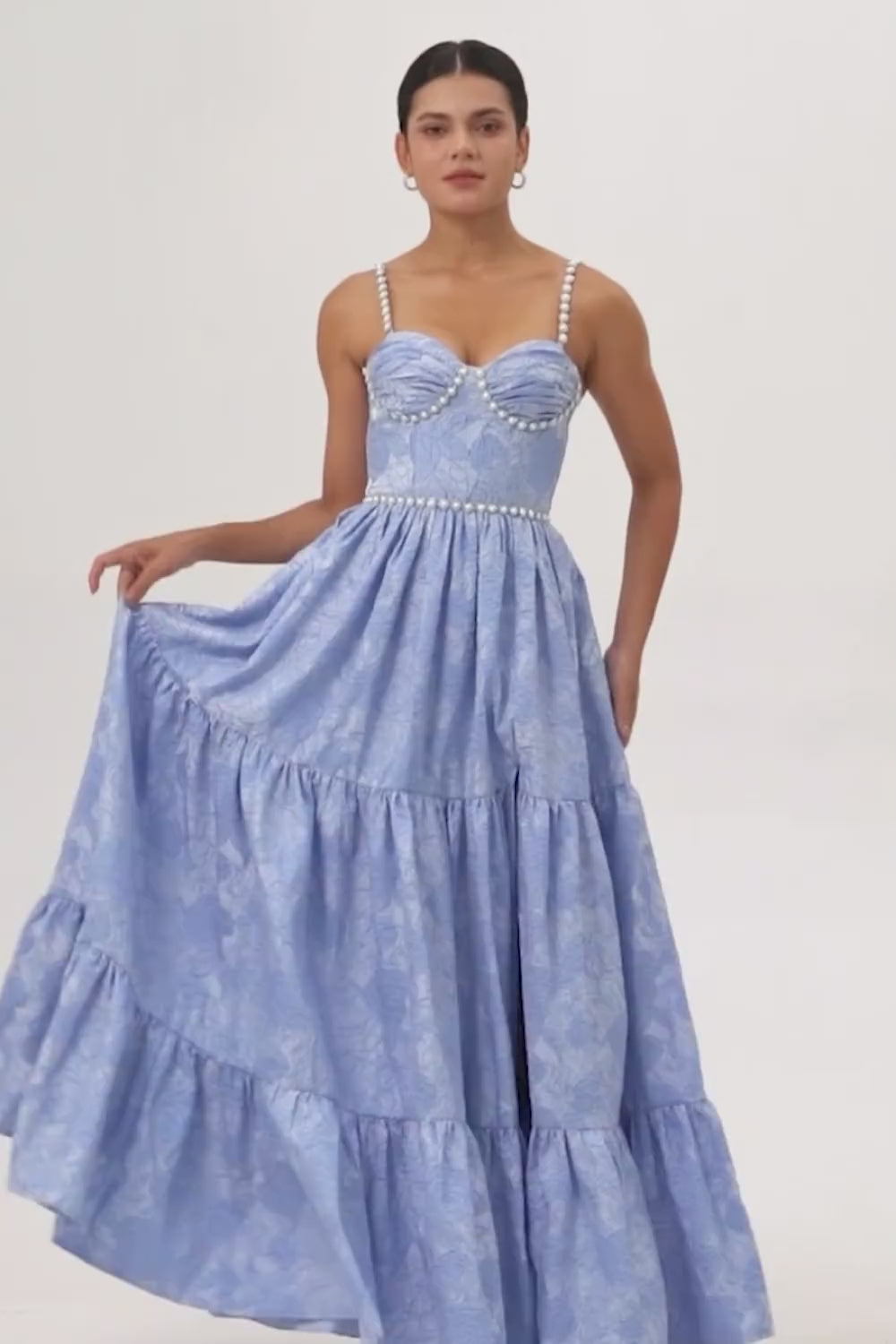 Blue A-Line Sweetheart Pearls Rose Brocade Long Jacquard Dress with Slit