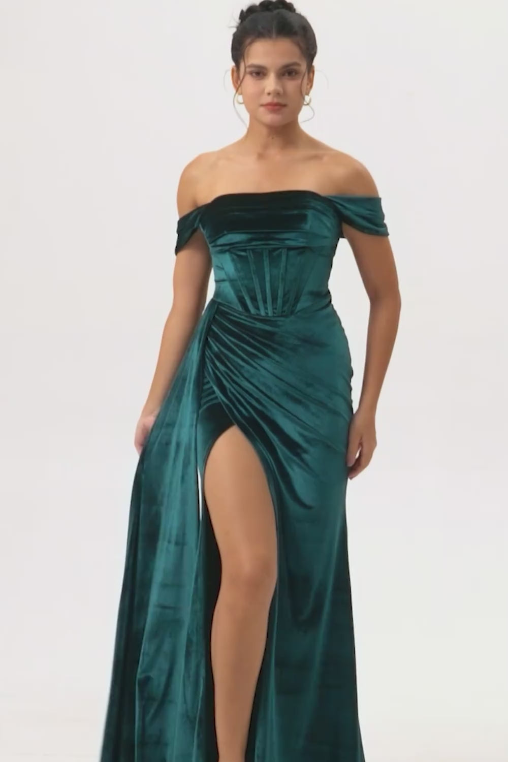 Peacock Green Sheath Off The Shoulder Streamer Velvet Long Bridesmaid Dress with Slit