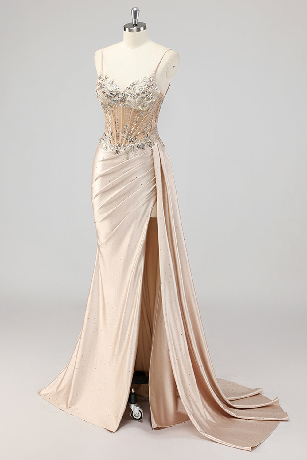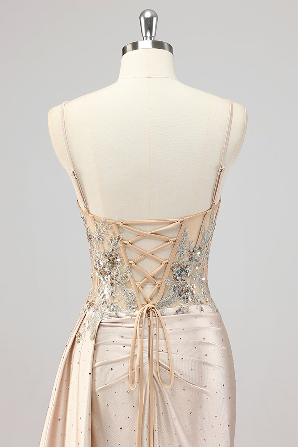 Champagne Mermaid Sequins Side Streamer Corset Prom Dress With Slit