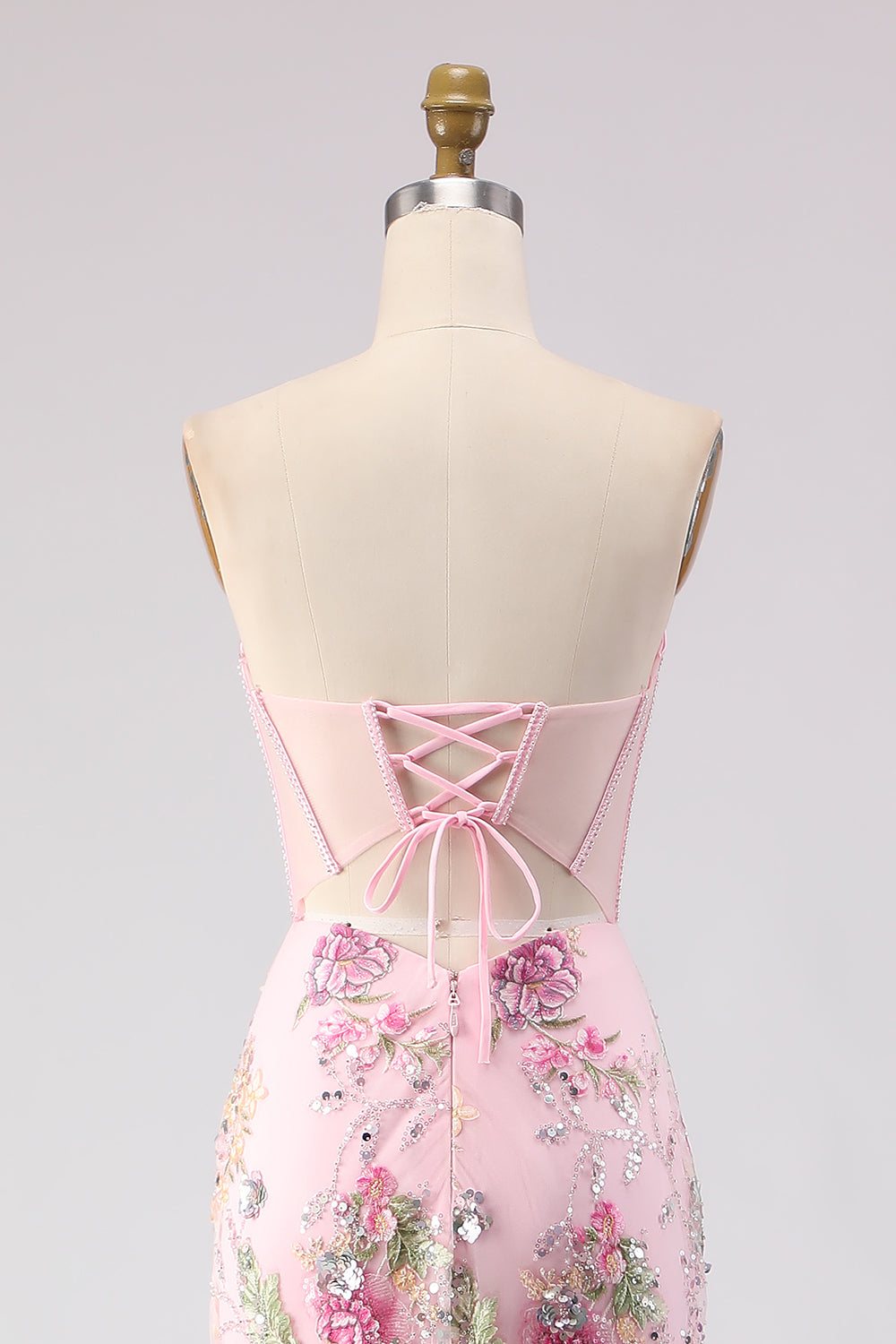 Pink Strapless Mermaid Beaded Corset Sequin Long Prom Dress with Slit