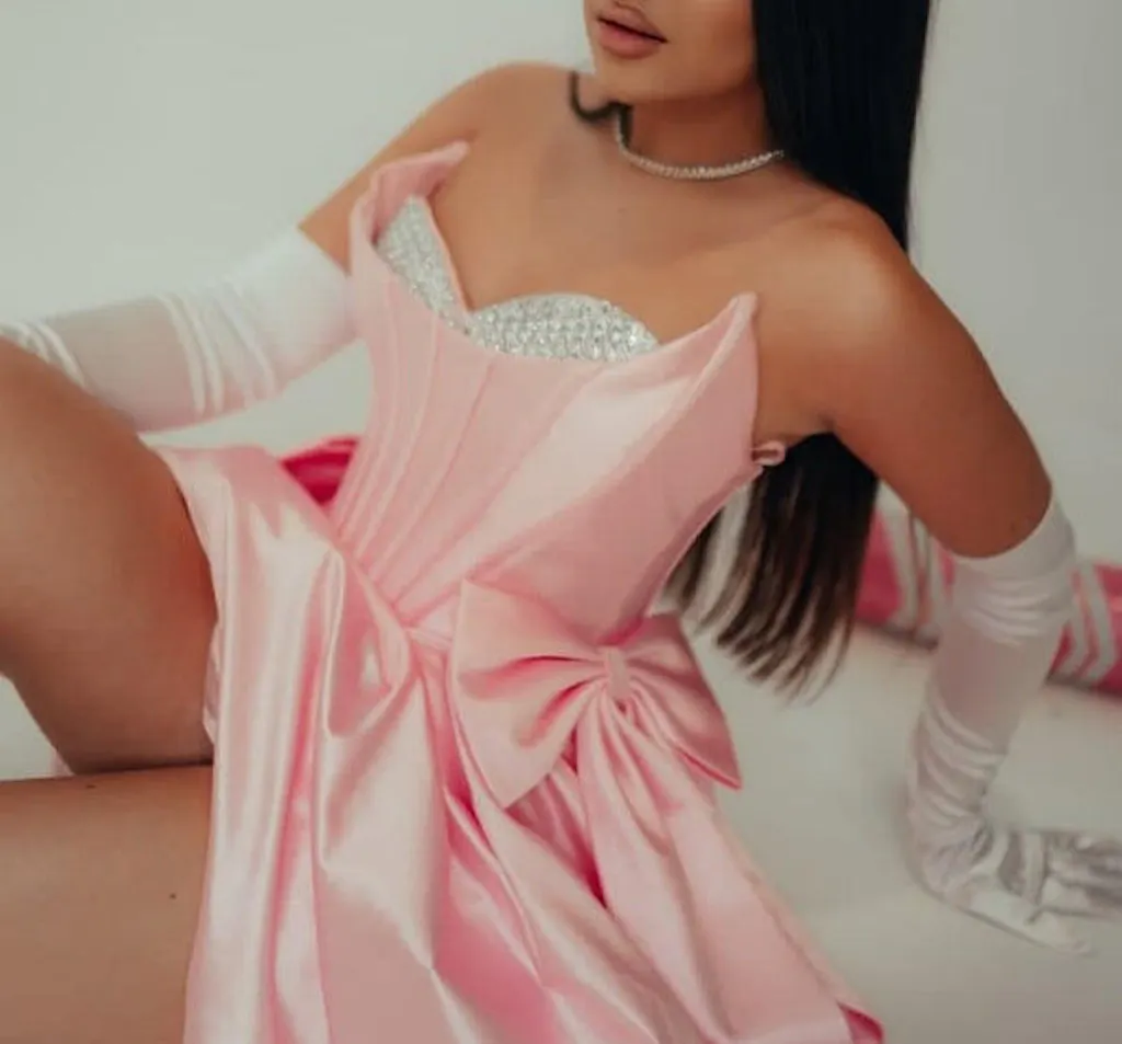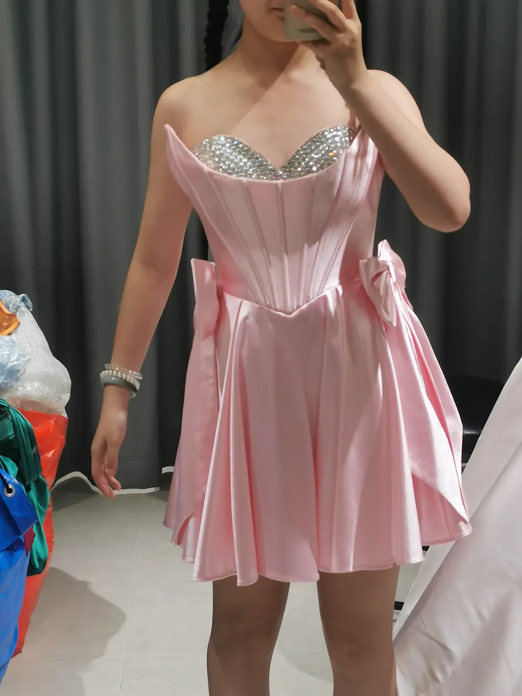 Cute Pink A Line Strapless Beaded Corset Ruffle Homecoming Dress with Bows