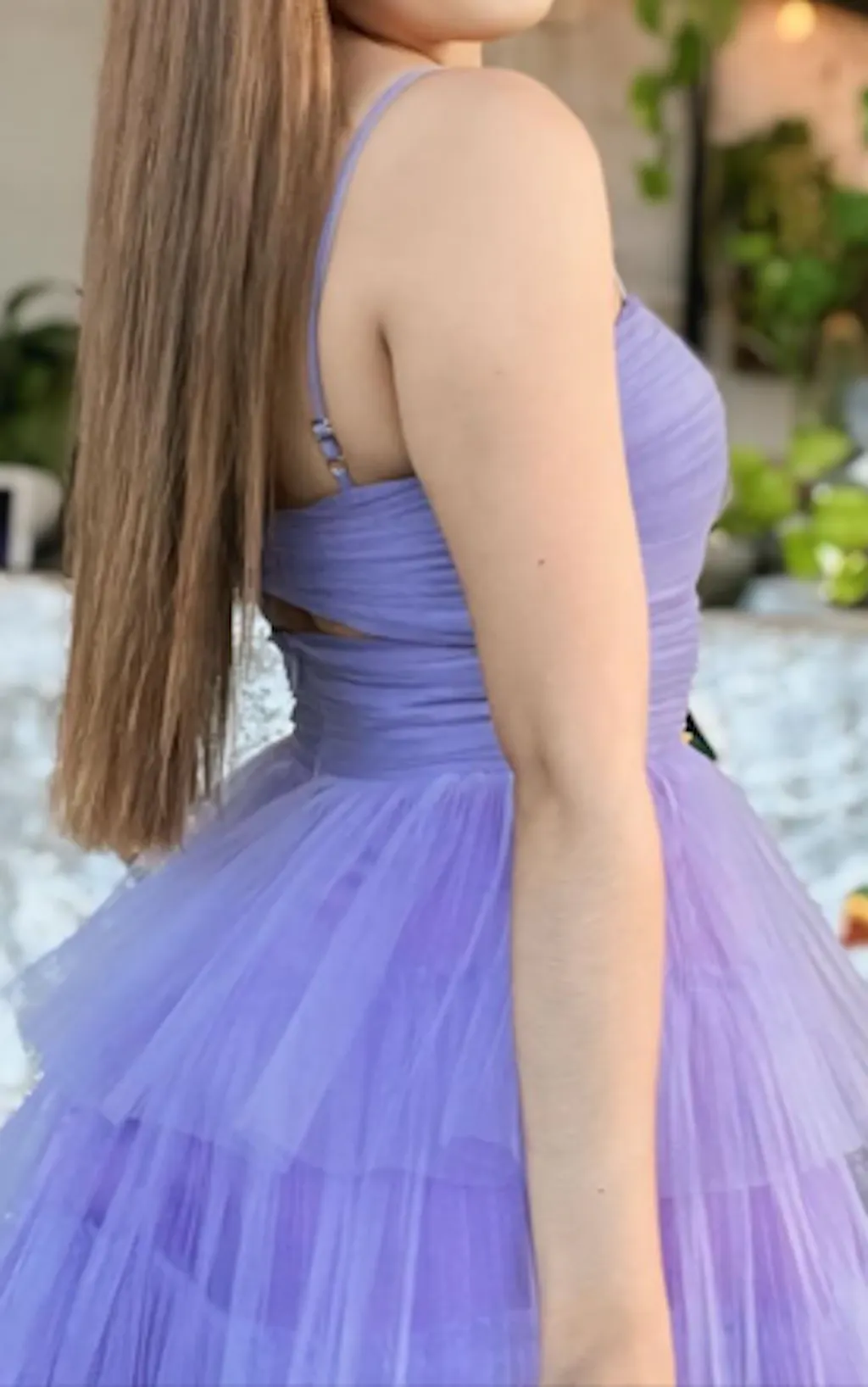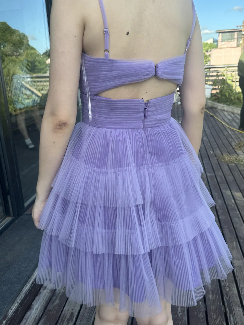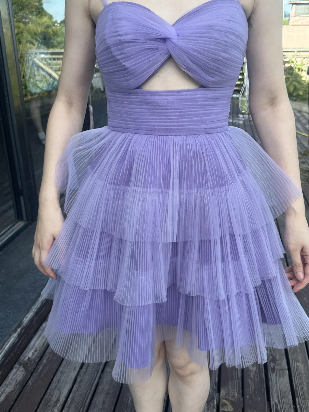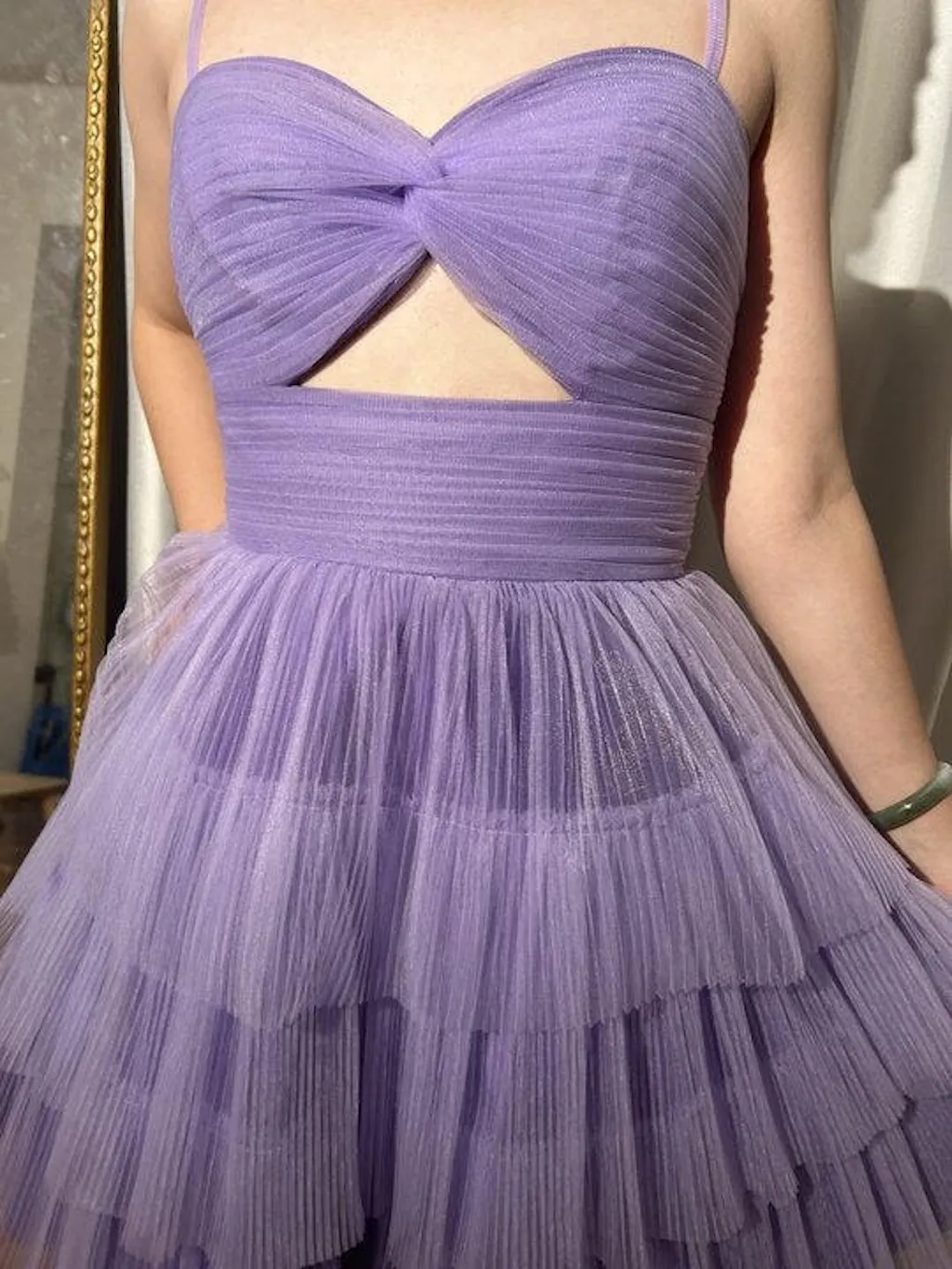 Cute Purple A Line Spaghetti Straps Short Tiered Homecoming Dress with Hollow Out