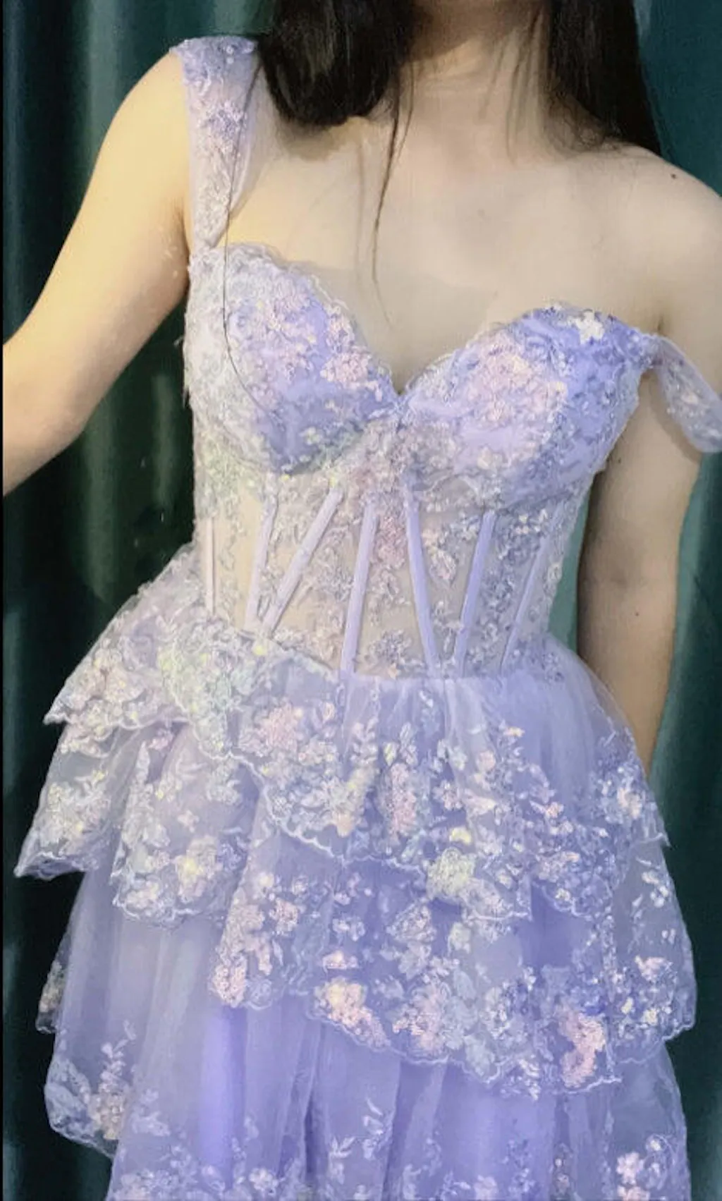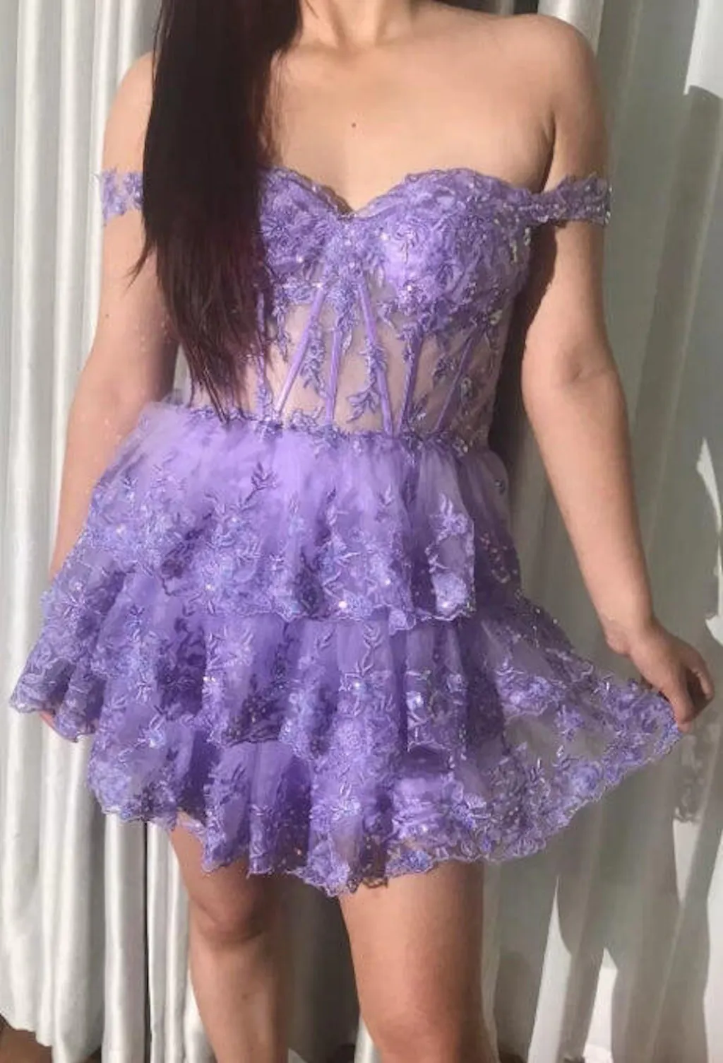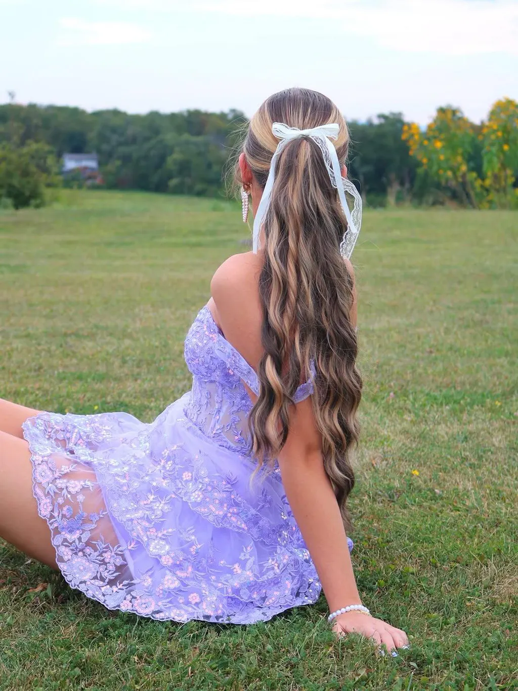 Princess A Line Corset Tiered Purple Short Homecoming Dress with Lace