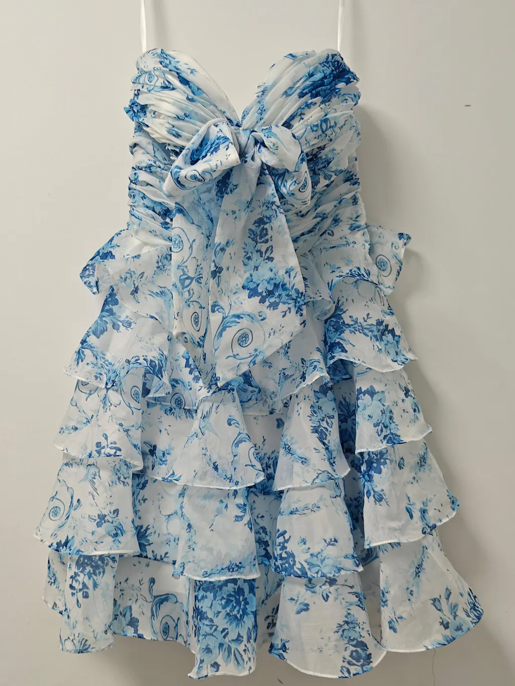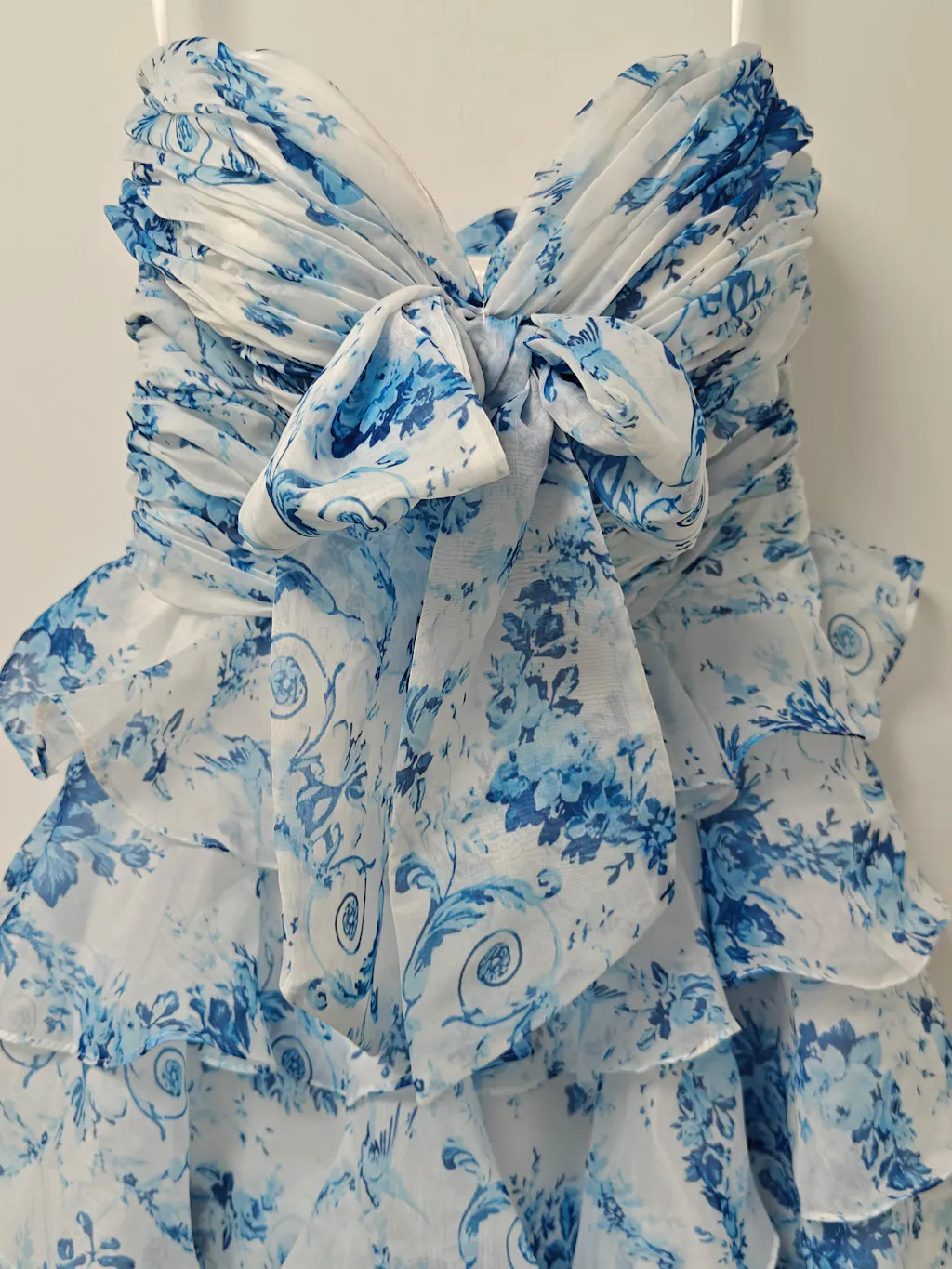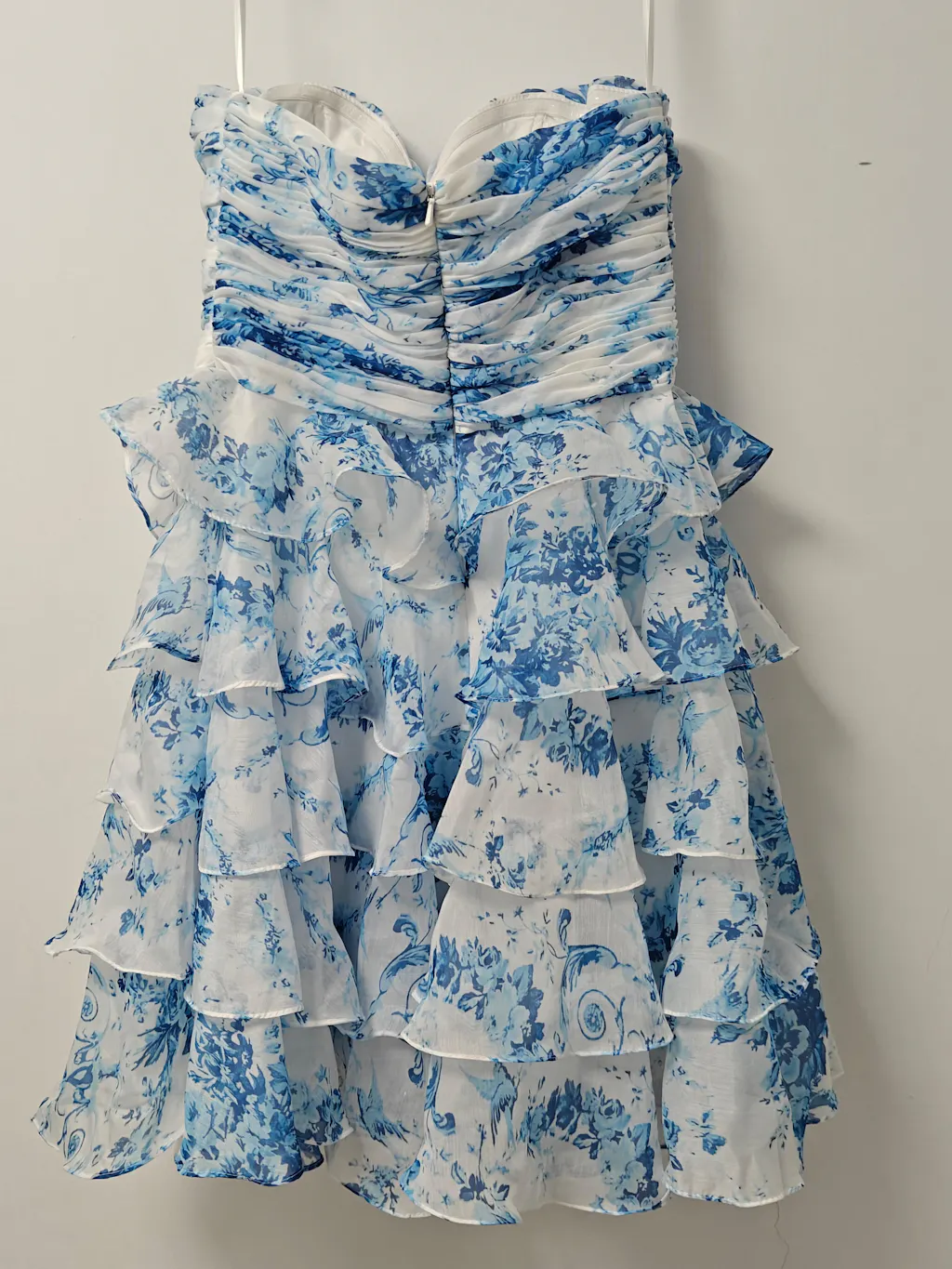 White Blue Flower A Line Strapless Tiered Short Homecoming Dress with Bow