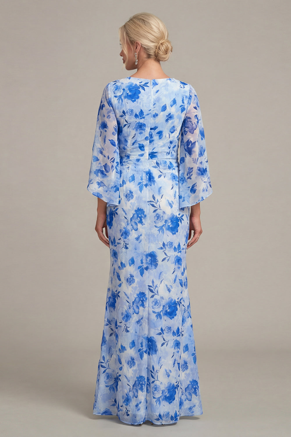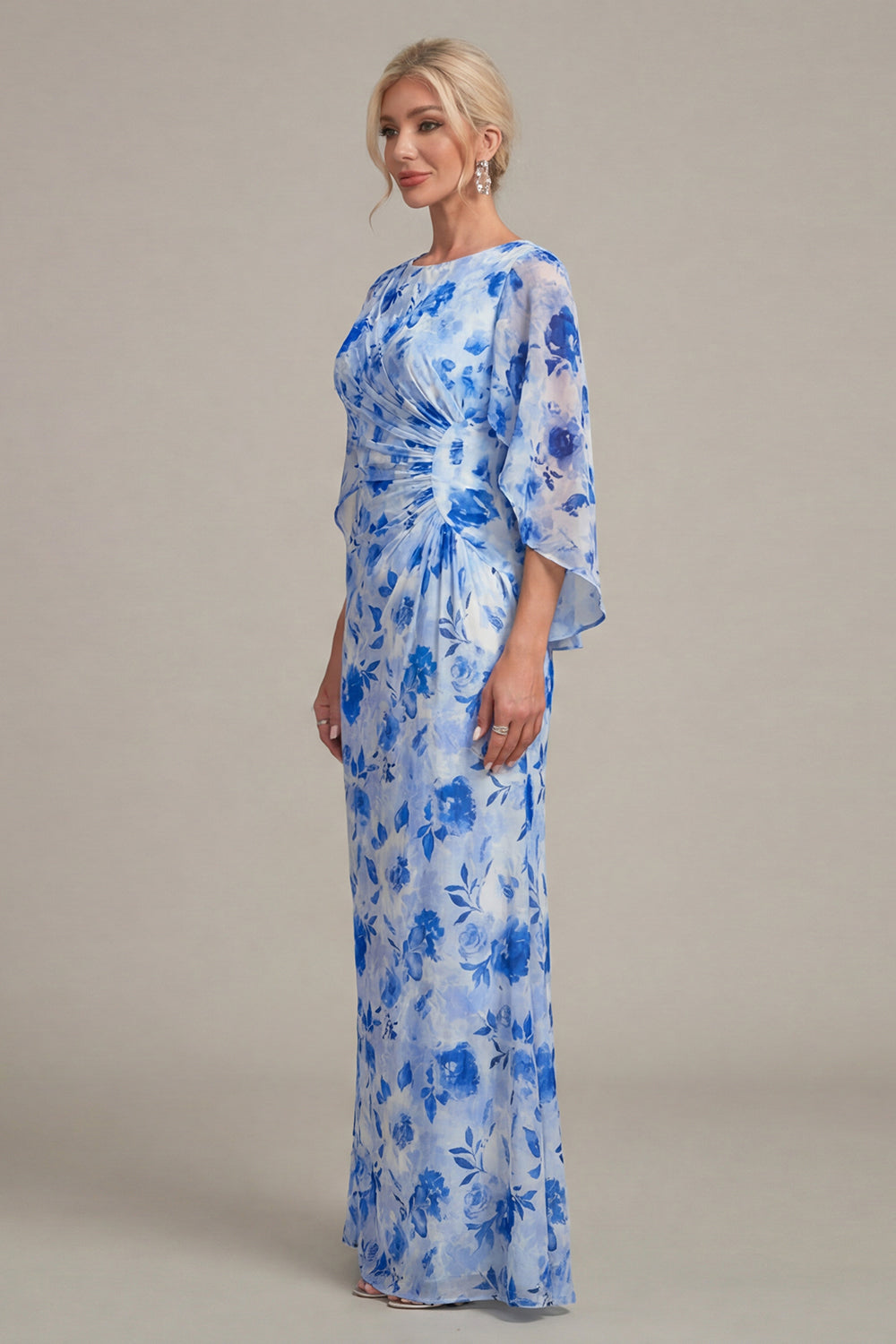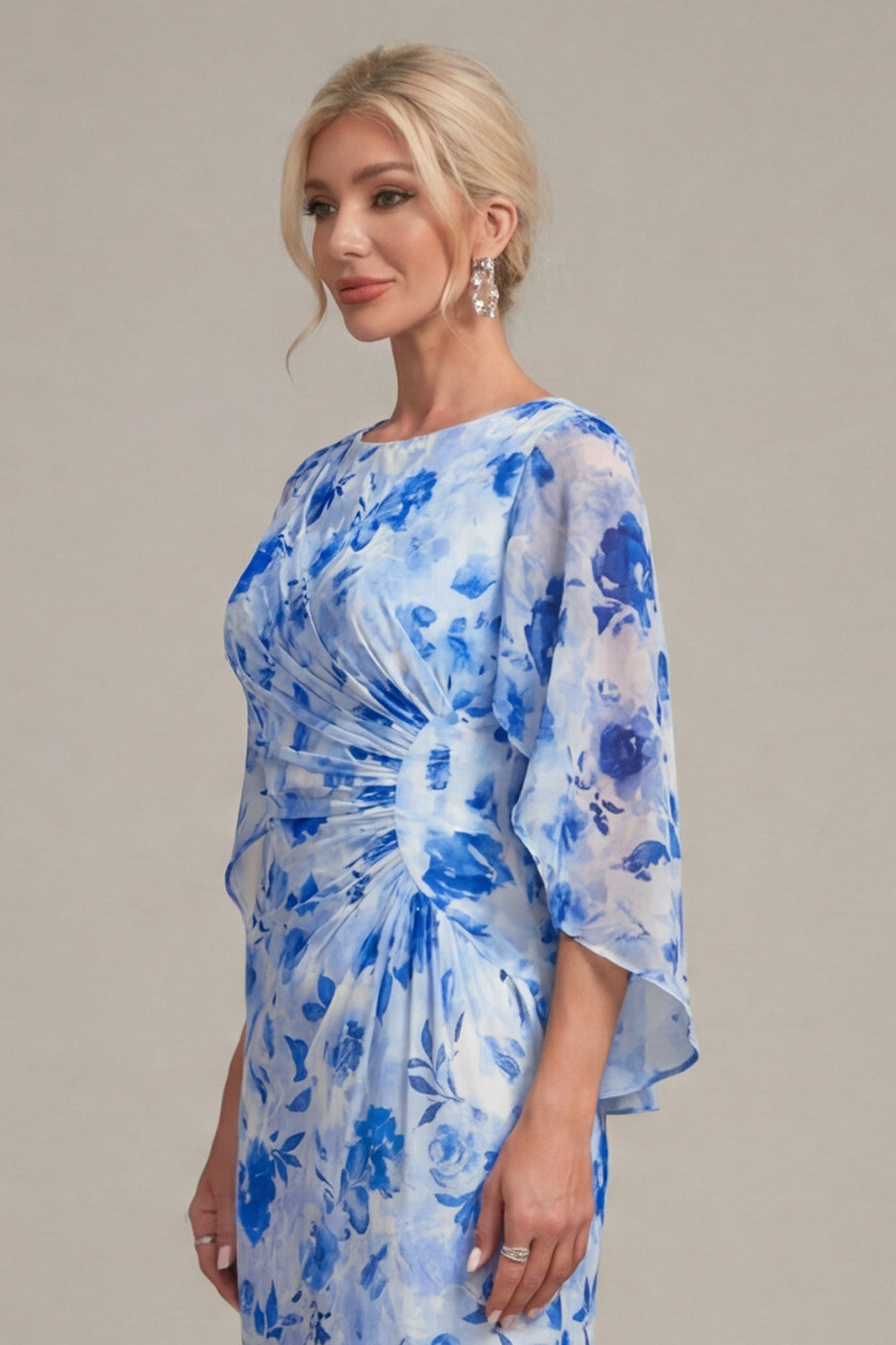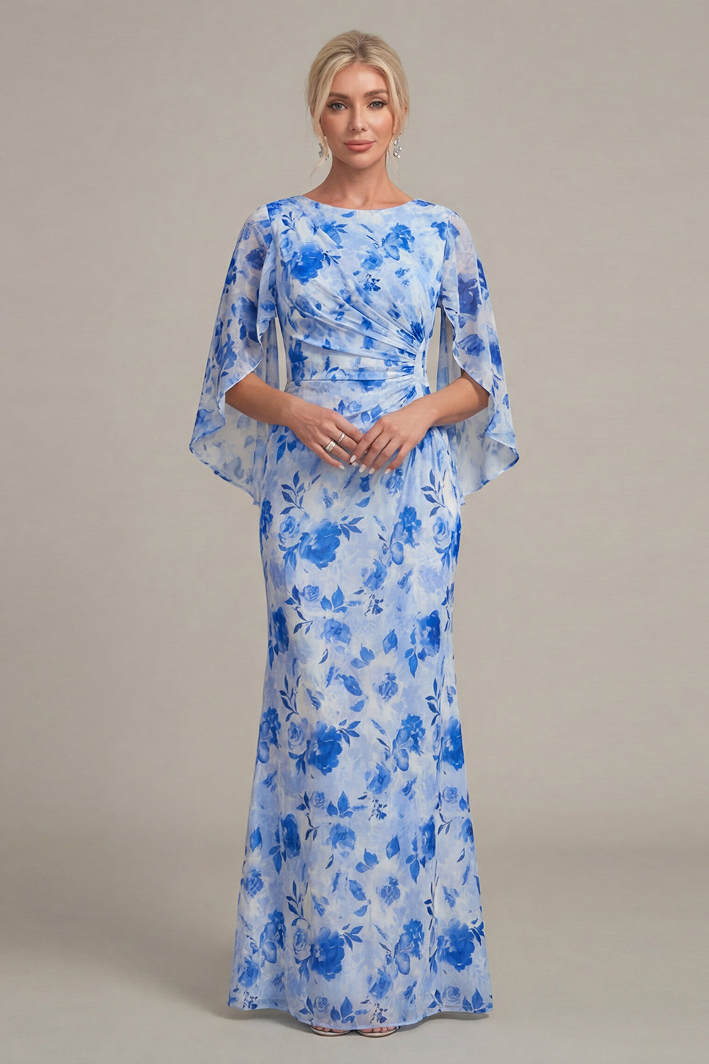 Blue Flower Sheath Printed Cape Sleeve Mother of the Bride Dress