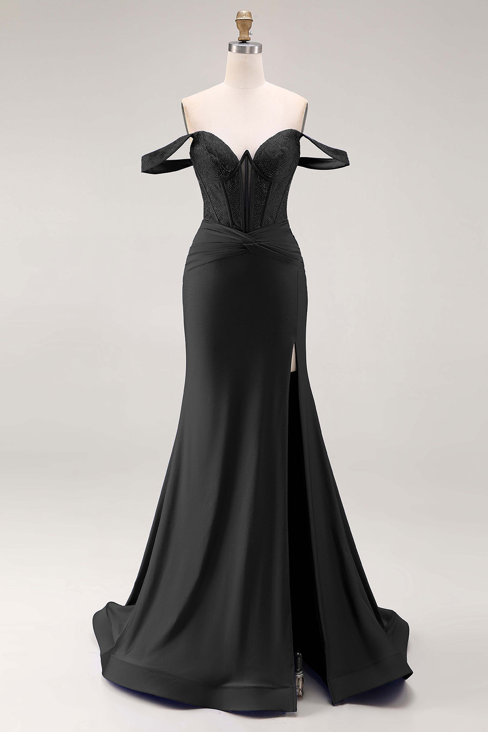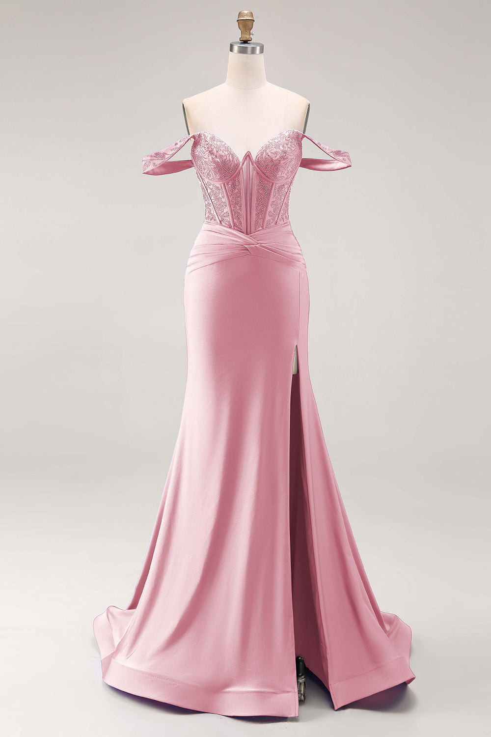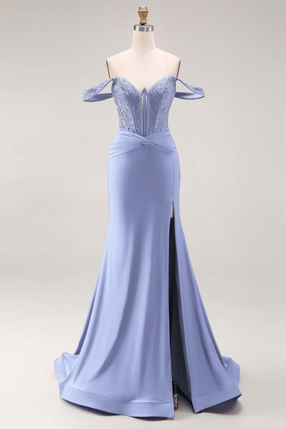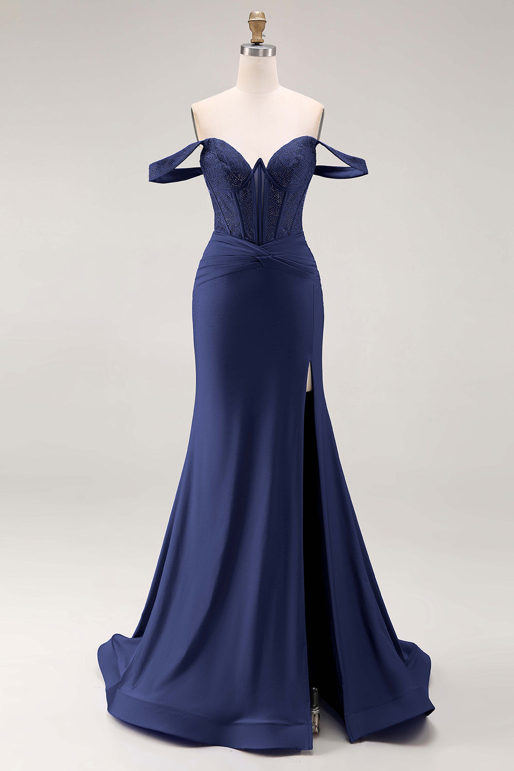 Off the Shoulder Royal Blue Beaded Corset Mermaid Long Prom Dress with Slit