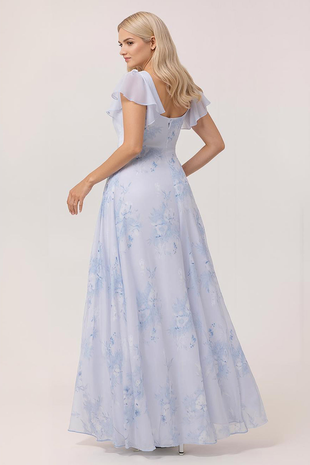Blue Flower A-Line Square Neck Chiffon Flutter Sleeves Long Plus Size Bridesmaid Dress with Slit
