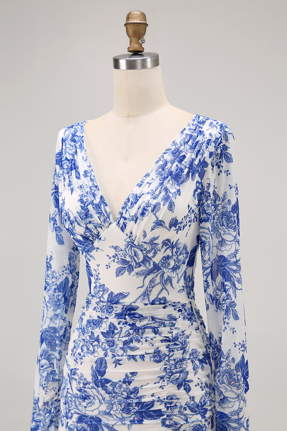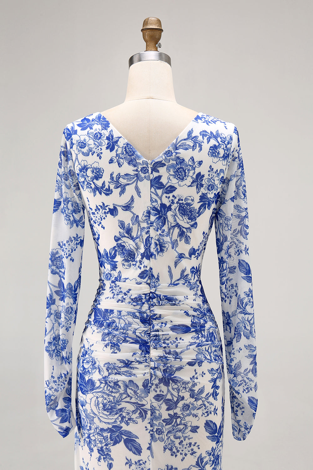 Blue Flower Mermaid V-Neck Long Sleeves Wedding Guest Dress with Slit